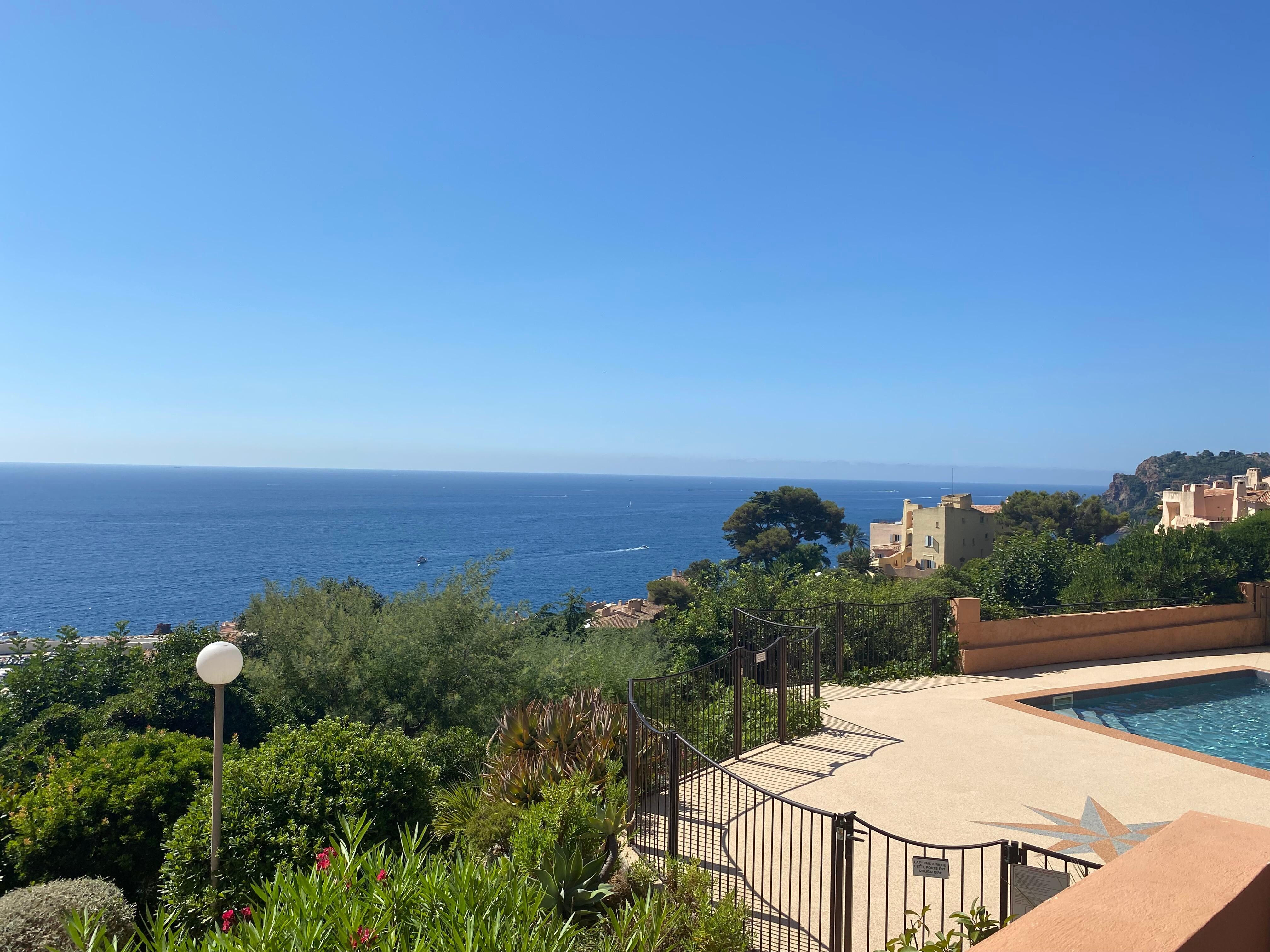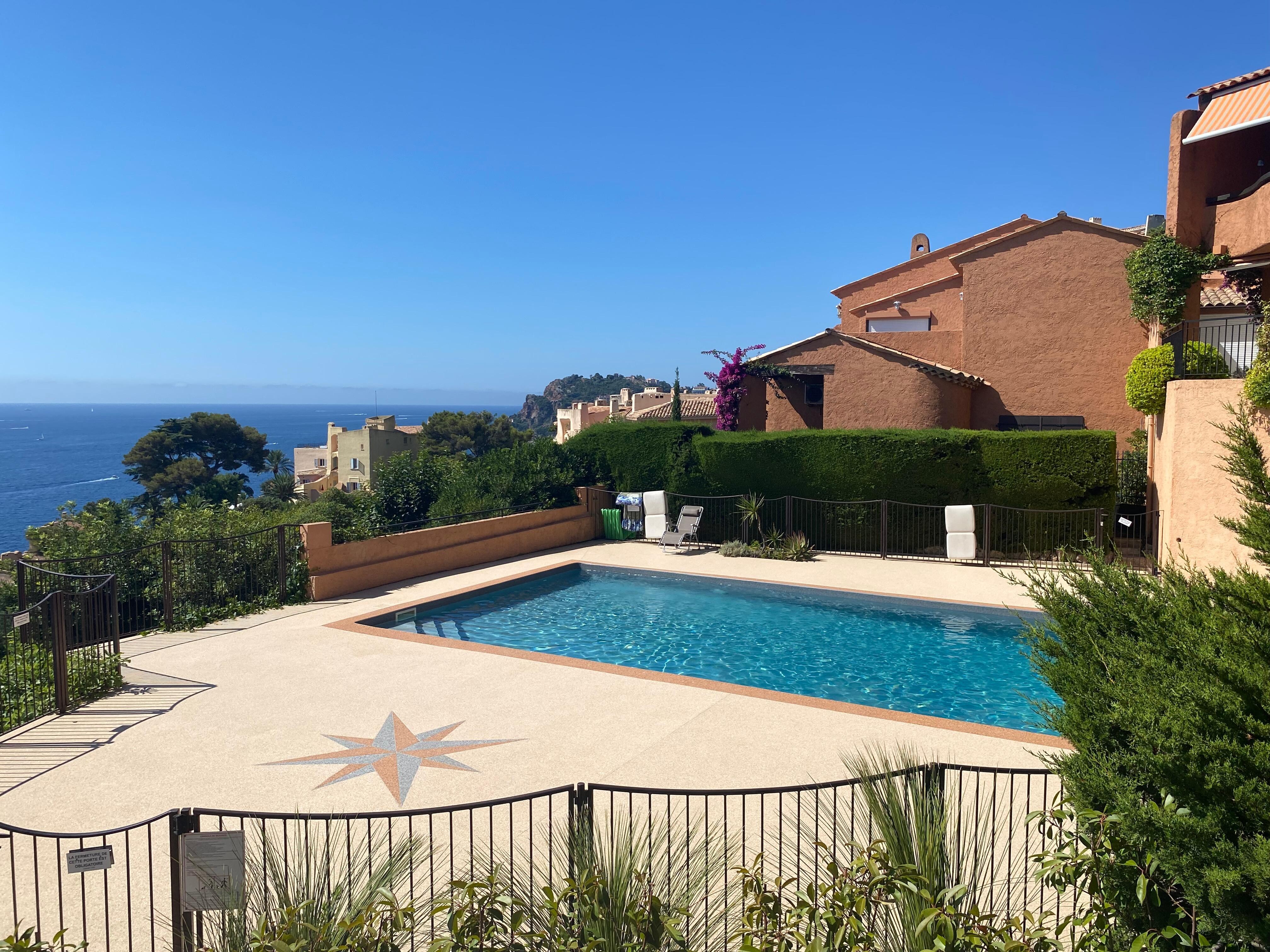 カンヌ近郊のTHEOULE SUR MERのアパートメント。美しいスイミングプール、静かで晴れやかな小さな住居にあり、カンヌ湾のパノラマの海の景色、3部屋の1階アパートメント+リビングルームのメザニン、キッチン新しい設備の整ったバスルーム+シャワー室、海上の非常に大きなテラス+上階のプライベートガーデン、専用屋外駐車場