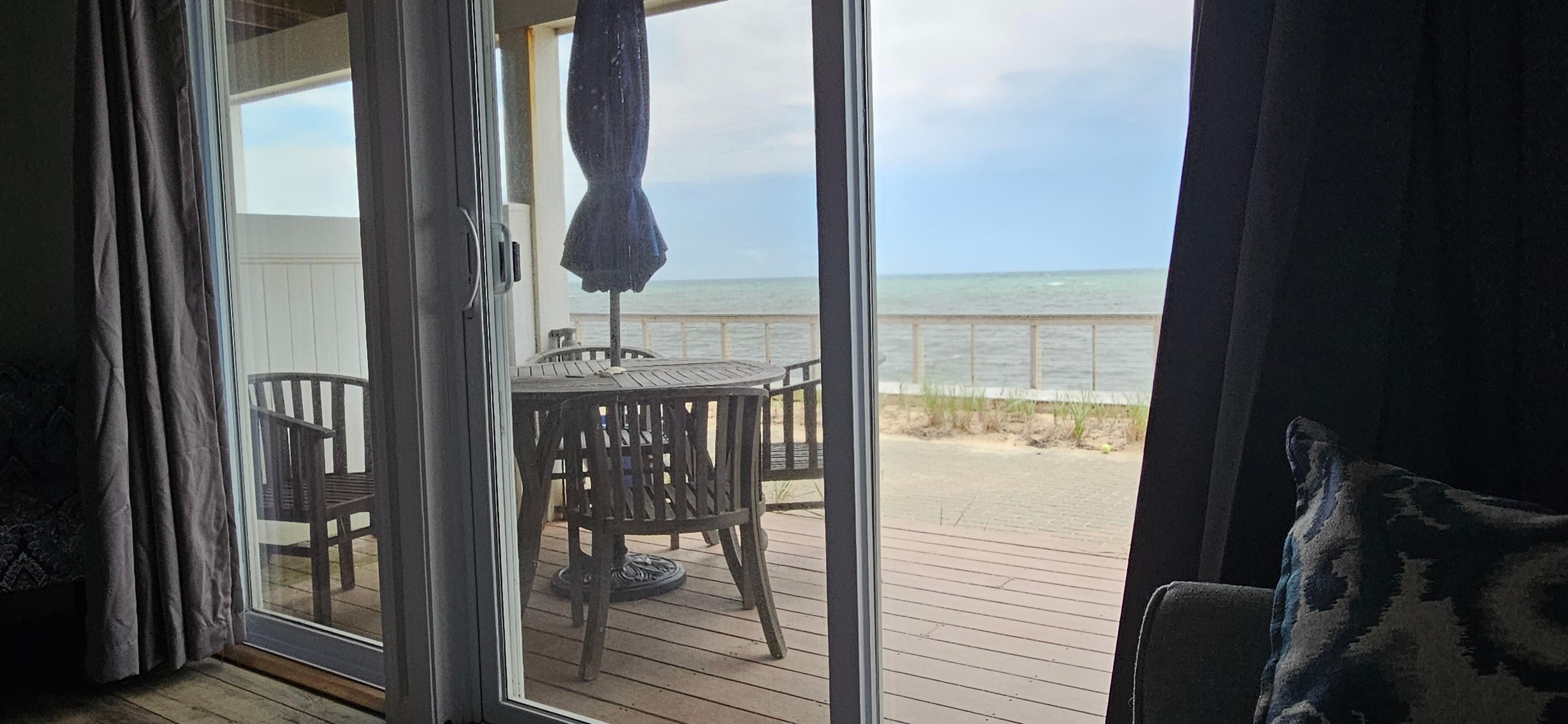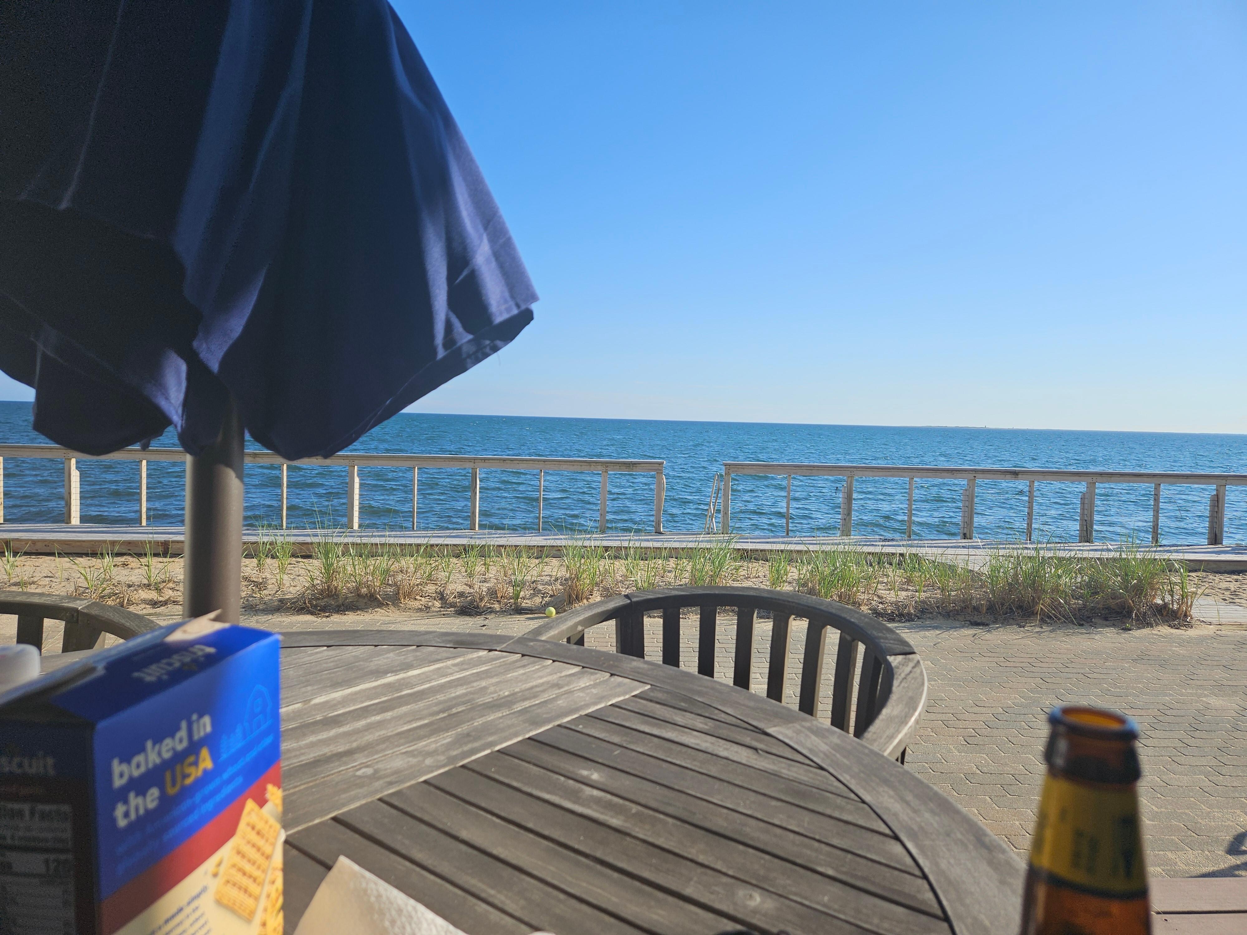 Delight in the beautiful, peaceful views of Cape Cod Bay from the main living area and the deck. Relax on the deck with your morning coffee, a good book or an evening cocktail while you grill up dinner. Step down from the deck into the shared common area featuring a patio, sand and wooden walkways. Stairs allow direct access to the beach below where you can watch the tide ebb and flow.
