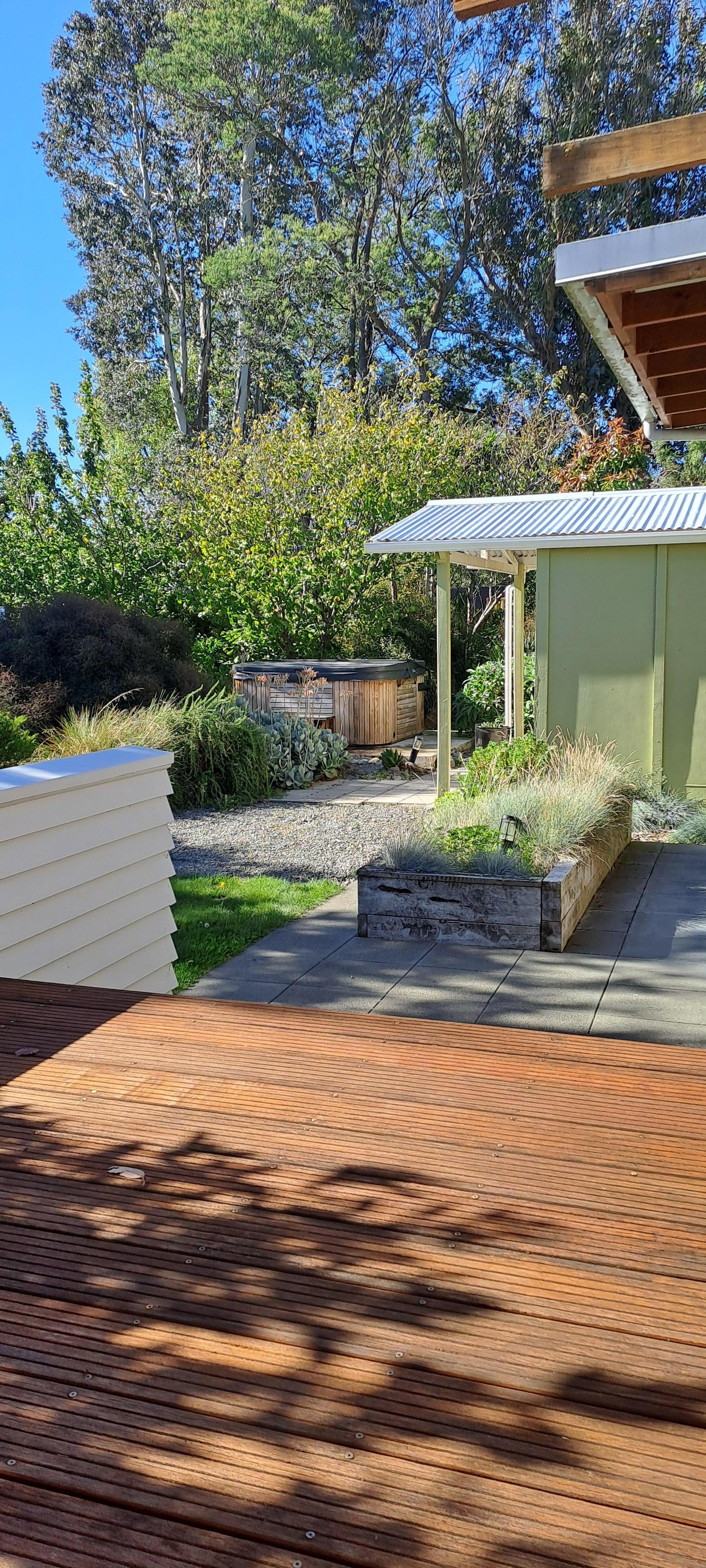 • Private amazing covered outdoor living with BBQ, large oak table with seating for 8, plus 4 bean bags