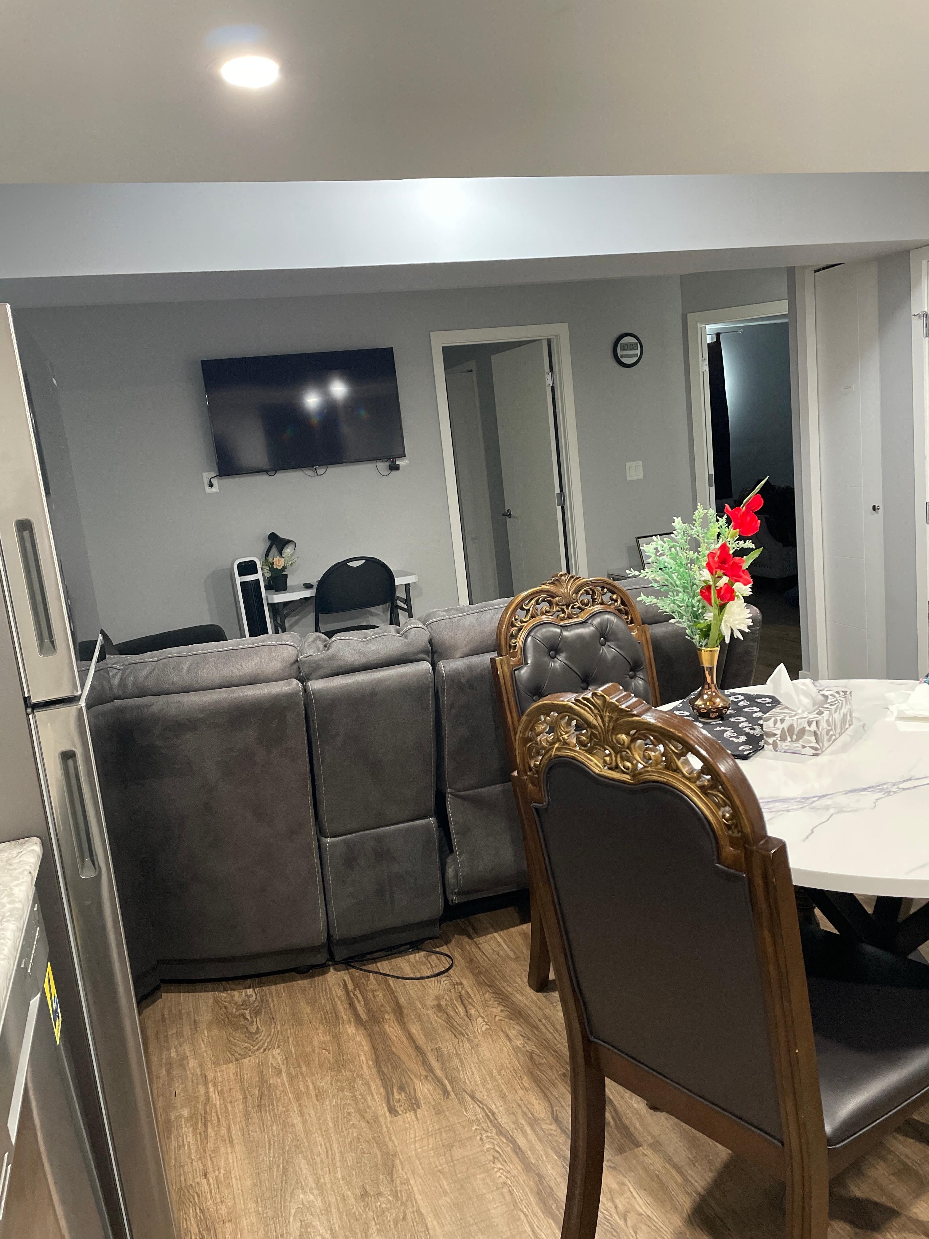 This stylish property is perfect for families and individuals. It is conveniently located near a gas station, convenience stores, and major highways. Nearby stores include independent retailers, Shoppers Drug Mart, Dollarama, a pharmacy, spa, a gas station, restaurants, and a car wash. The university, Landmark cinema, the stoked center, shopping malls, and gym ARE 8-10 min drive. The public bus route is easily accessible right in front of the building. The rooms and living area are spacious and comfortable. Guests can enjoy free live Roku TV channels for their entertainment. There is a dedicated workspace and free Wi-Fi. For safety, the home has a carbon monoxide detector, smoke detectors, fire extinguishers, an outdoor security camera, and a smart lock on the main door. As a newly built property, all appliances are brand new. Amenities include an in-suite washer and dryer, refrigerator/freezer, dishwasher, electric stove, and microwave. There are plenty of free street parking options.