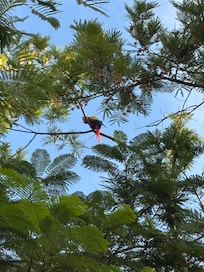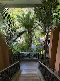 Our spacious second floor condo is located in building 7 at the base of Altamira Mountains. Monkeys are sometimes spotted in in trees across from our building entrance way. The spacious covered terraces overlook one of the many free-form swimming pools; the first fairway of La Iguana golf course and the rainforest covered hills beyond. Enjoy coffee on the veranda and listen to the sounds of nature and watch the Macaws fly by.