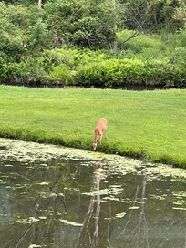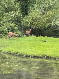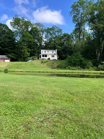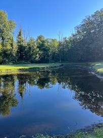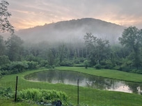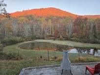 The secluded location has fantastic views of the mountain and pond in the back yard on the 25 acre estate. Everyday provides for something new to see: the blue heron fishing at the pond, hawks circling over head, turkeys traveling through the back yard, deer at dusk or dawn, or just the clouds floating over the mountain.