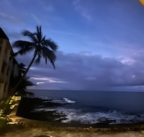 We offer not just a peekaboo, but a FULL ON VIEW of the ocean! Platinum rated, located within blocks of Kona with free-reserved-covered parking, elevator (rare in other complexes), and even more rare Central AC! The lanai-balcony looks out over the ocean, 30' from the waves. Your entertainment is the surfers next door, and during some seasons dolphins and whales swim by.
