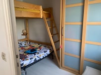 1 bedroom with 2 double beds 140 X 190 (bunk) and a wardrobe.