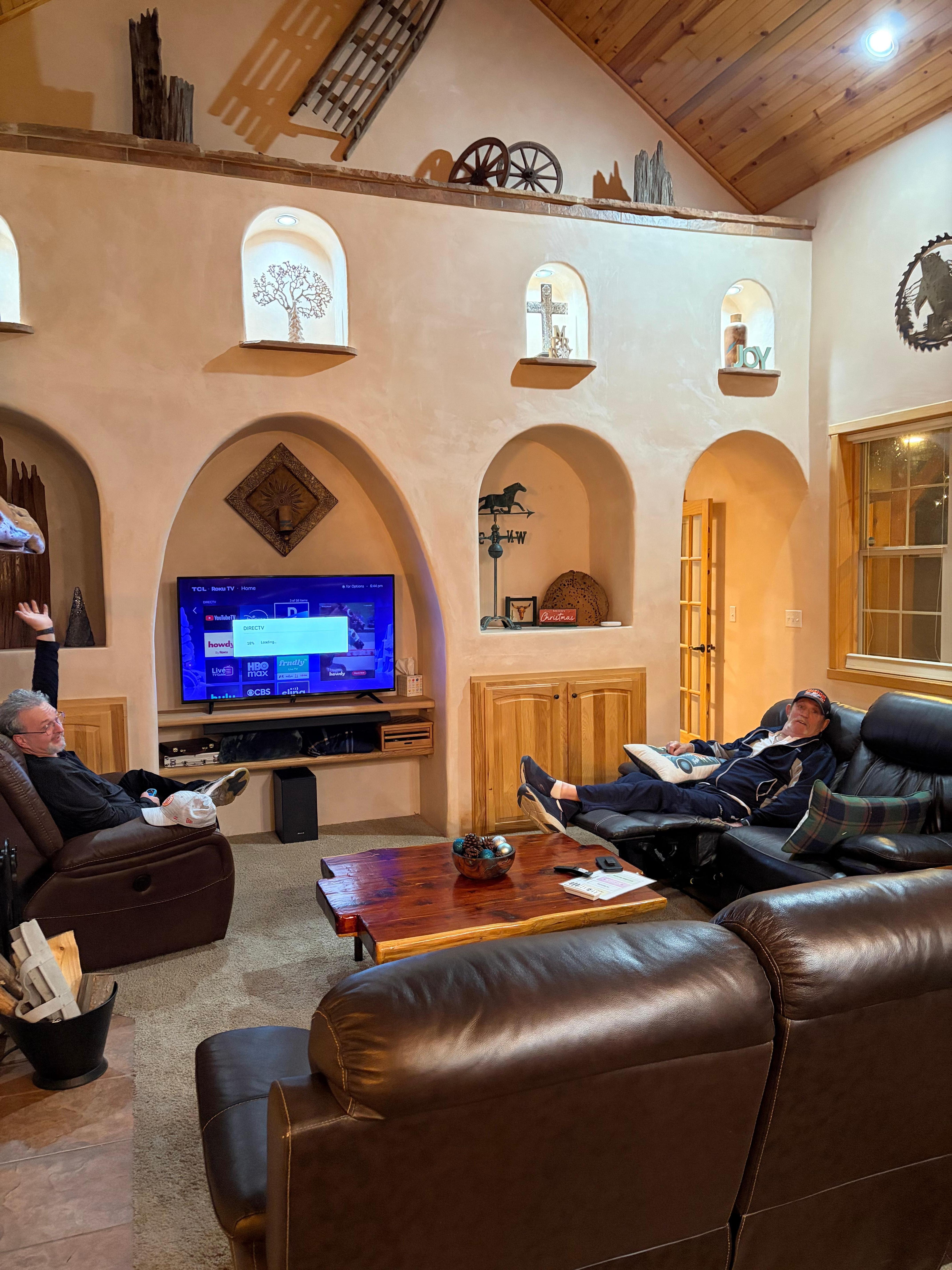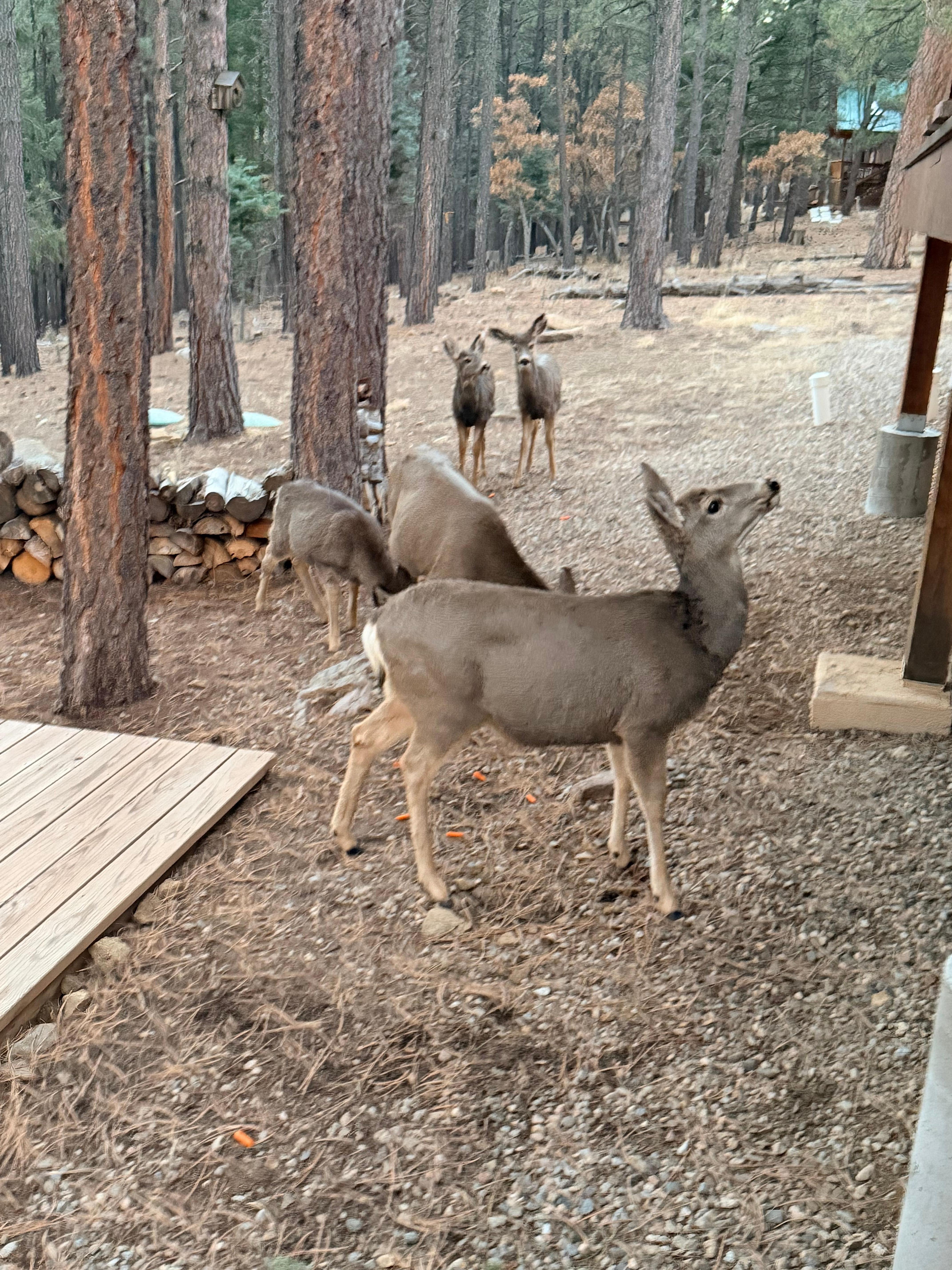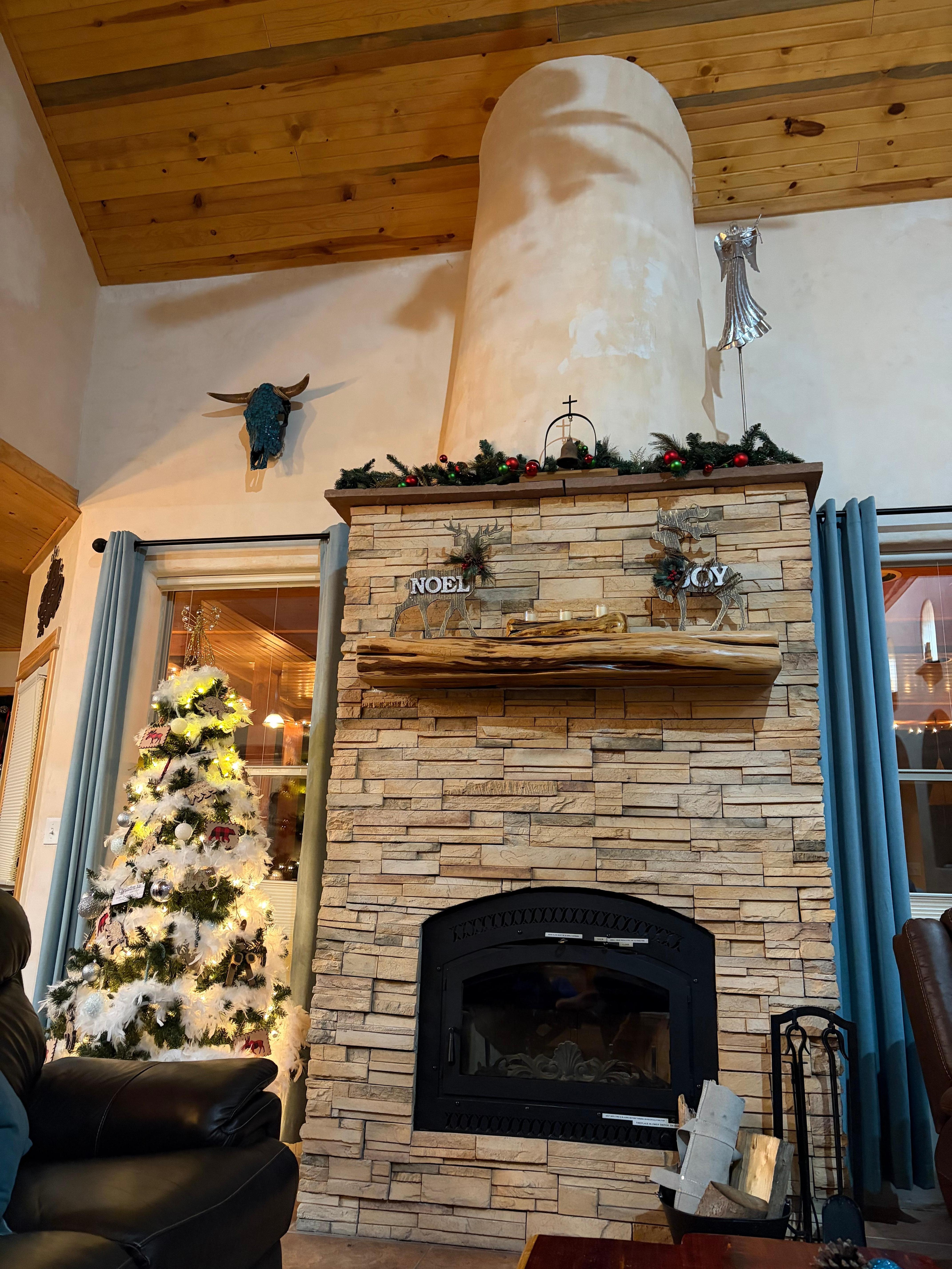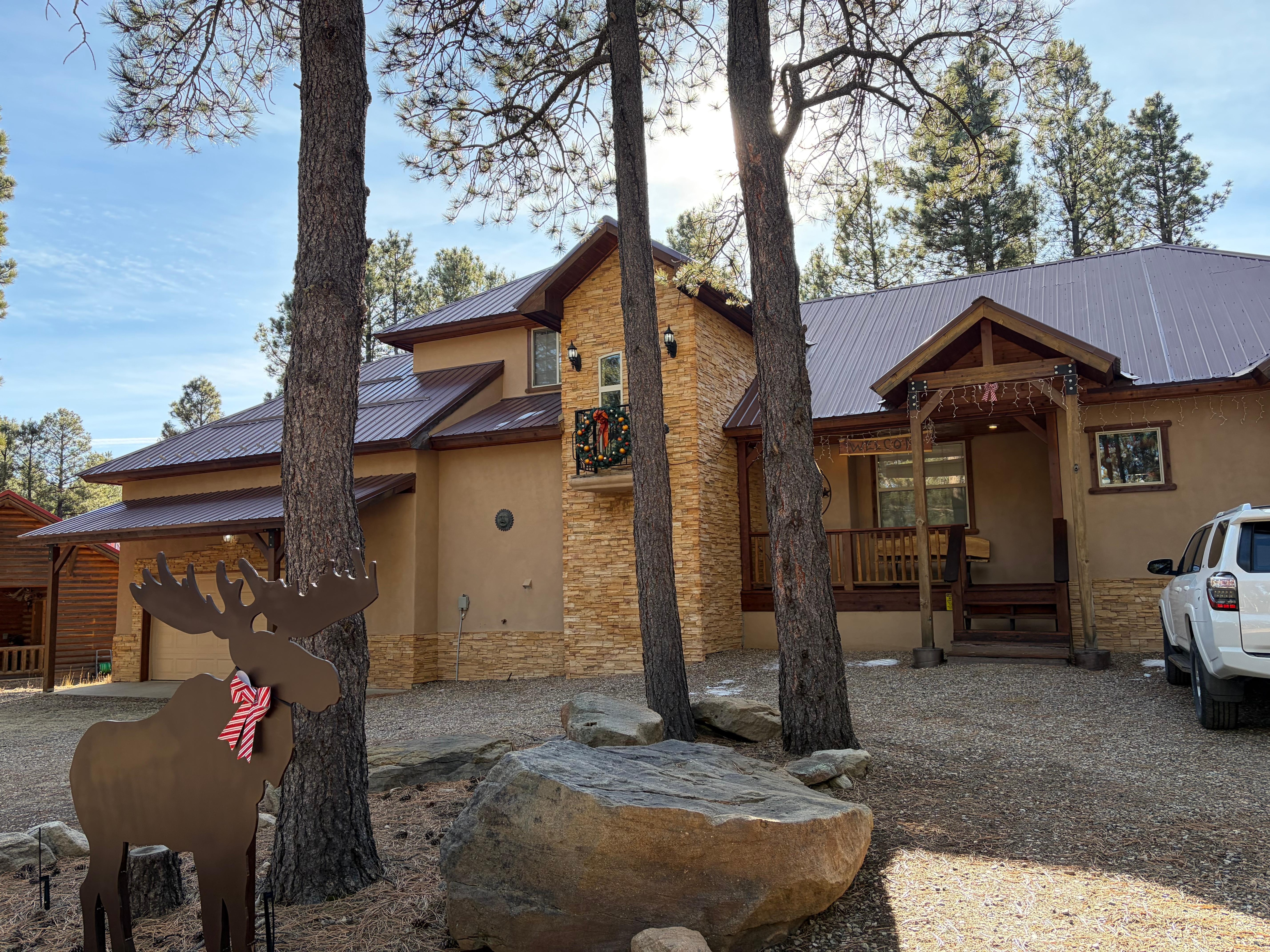 This mountain home sleeps 12 and is close to everything Angel Fire offers! Situated 2 minutes from the grocery store and 5 minutes from the slopes, the location is perfect! We purchased this home in October 2018 and have furnished it completely with new furnishings and appliances, and custom touches throughout the home. There are 4 bedrooms and a bonus room with a smart tv. The living room boasts a 55" smart tv and sound bar, leather couch, love seat and recliner, and wood burning fireplace for relaxing after fun on the slopes or a day on the PGA Golf Course. The master bedroom has a king sized bed, smart tv with sound bar, and a private bath with tub and separate shower. The custom built dining room table seats 10, and there is additional seating for 7 at the bar and custom built buffet. The garage is equipped with a basketball hoop, ping pong table and custom shuffleboard for an added bonus, and is sure to bring out the competitor in everyone! Fiber optic Wifi is included! Enjoy grilling on the back deck, the beautiful pine trees in the back of the house, and walk the trails down to the greenbelt below. Sit back and relax in the Adirondack chairs and light a fire in the firepit while enjoying the tall pine trees and incredible Angel Fire atmosphere that this deck offers. This is the perfect mountain getaway with year round activities and all the comforts of home!