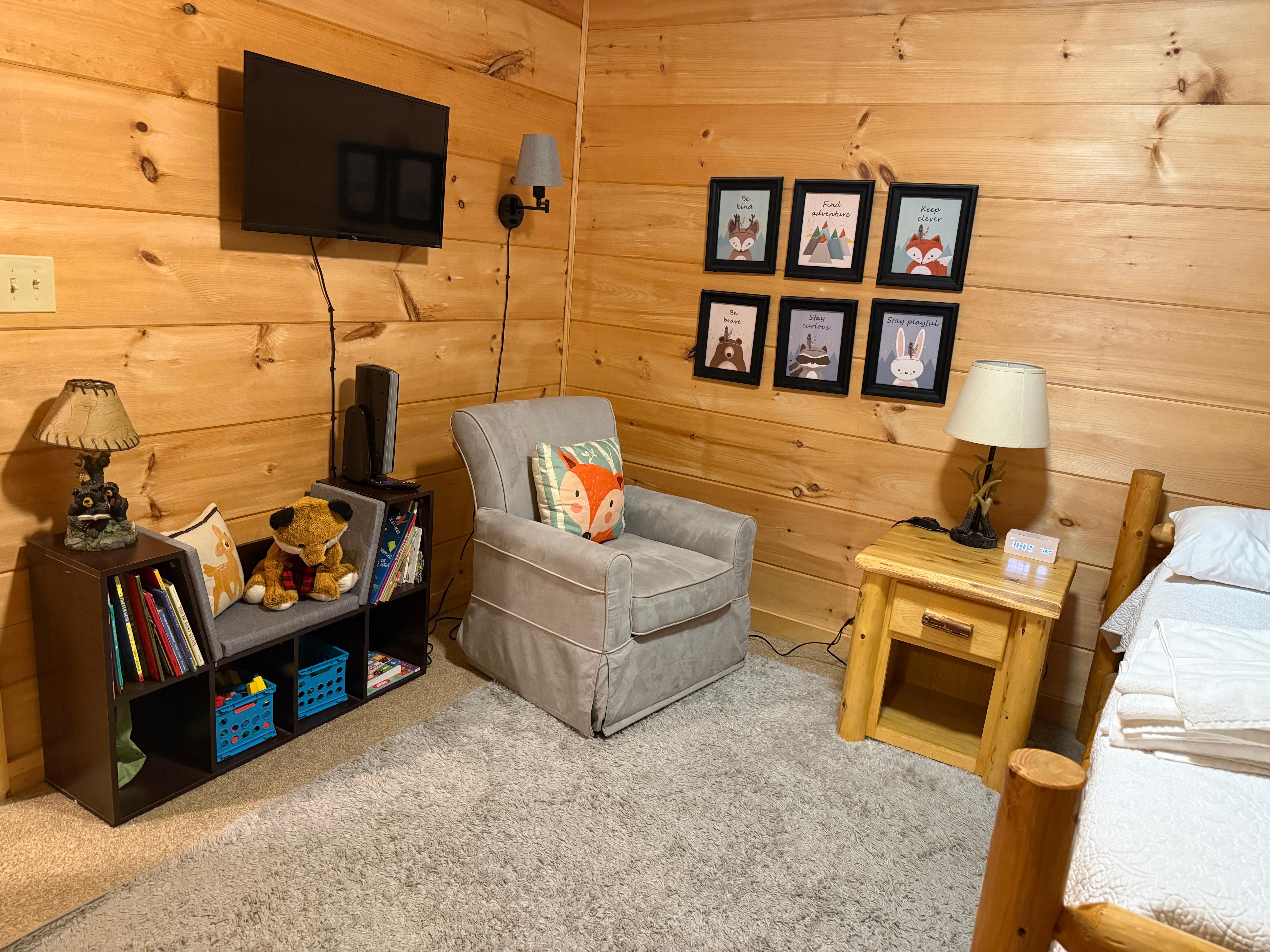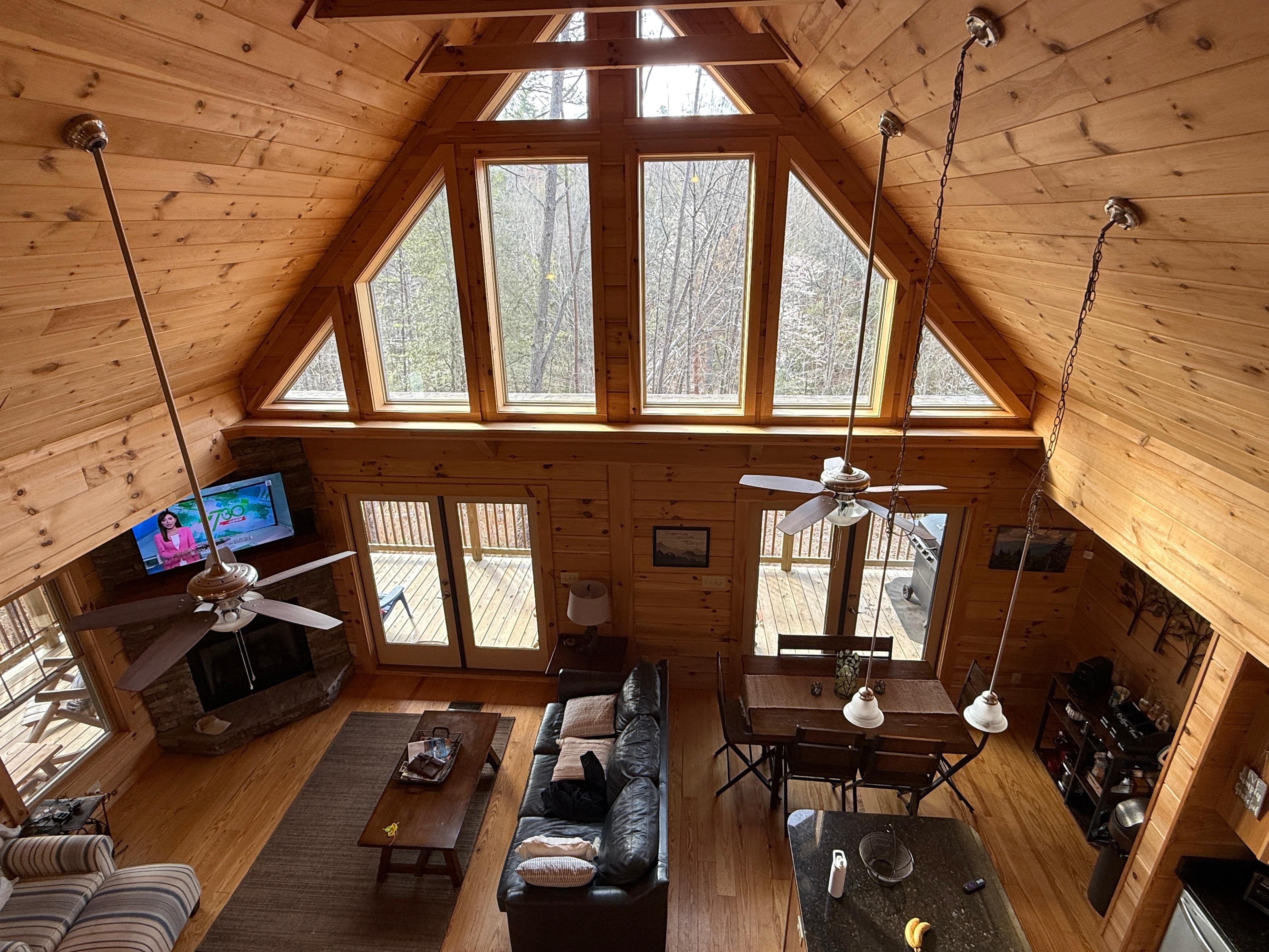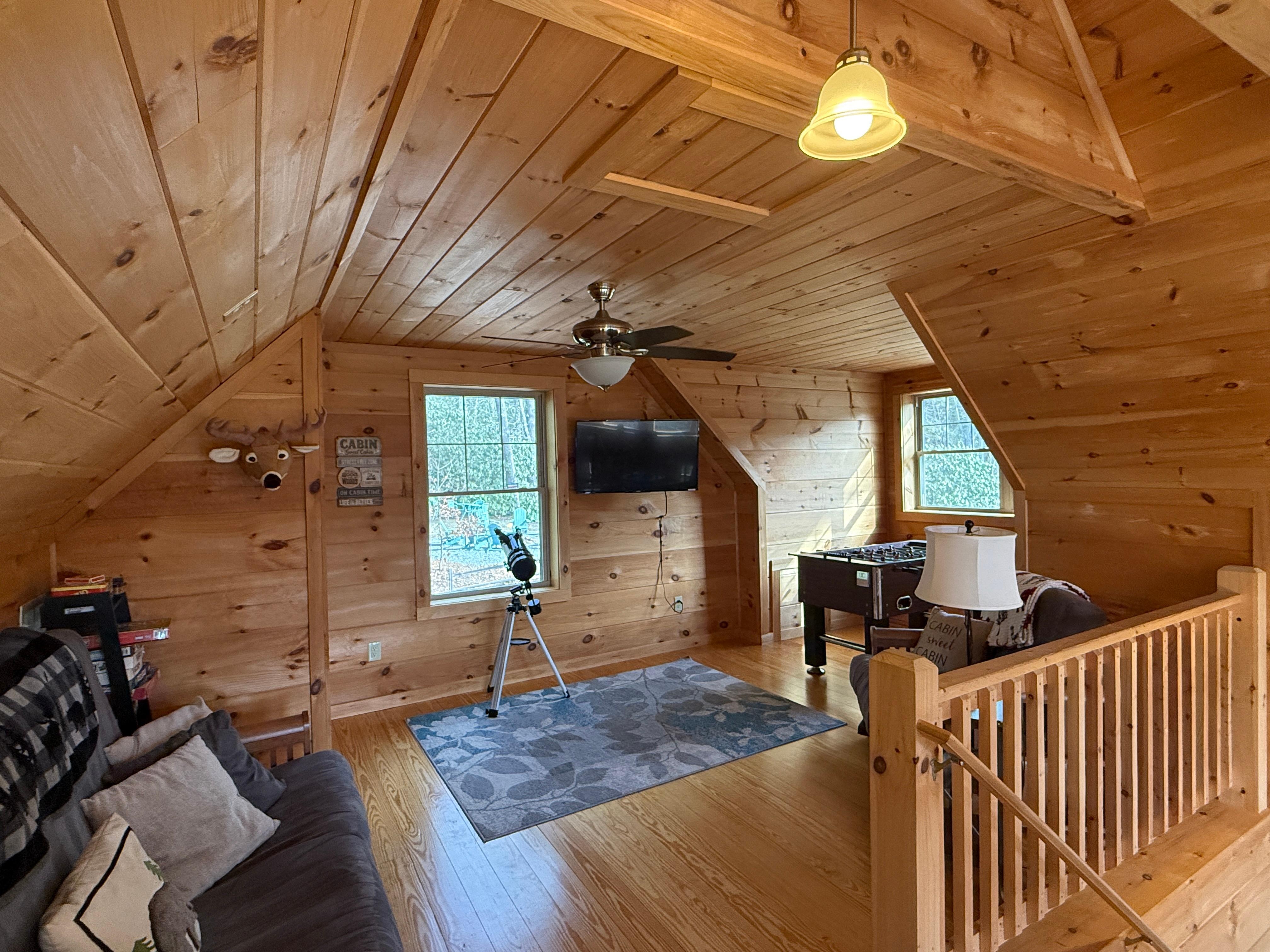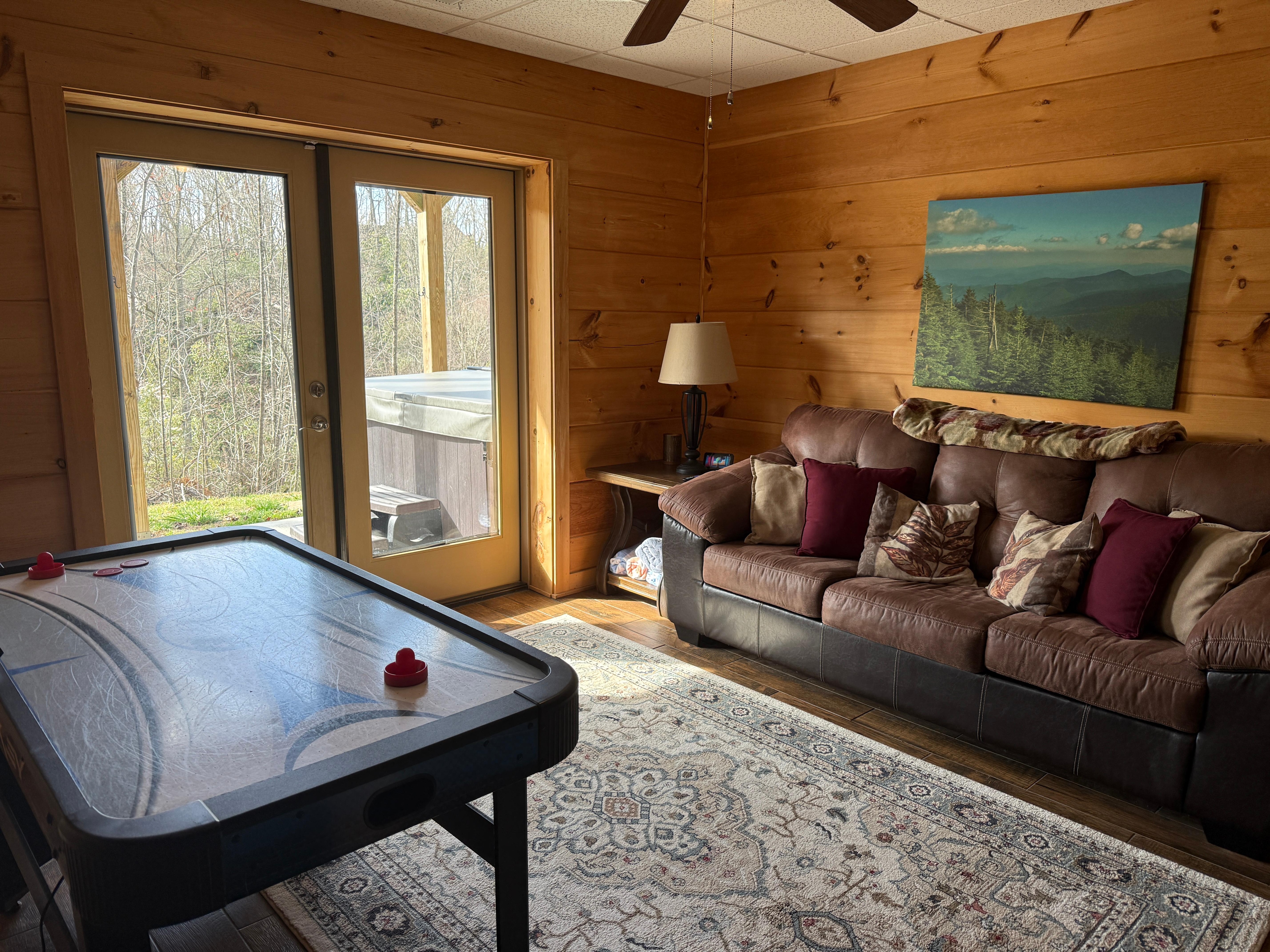 A covered deck allows you to enjoy the views of woods and nature in comfort. The covered deck also features seating and a BBQ gas grill. A children's bedroom has bunk beds (full & twin), and the loft and family room has a sofa bed and queen futon for additional guests. Foosball and air hockey tables in common areas allow everyone in the family to get in on the fun. Have a campfire & roast s'mores at the firepit (firewood, fire starter, and s'more sticks provided). Go hiking on your own 6 acres. Explore through the wooded hillside dappled with rhododendrons, mountain laurel, and holly trees. Have a picnic at the top of the property while enjoying views of the surrounding mountains. The cabin is set on a hillside, so the driveway is steep, but it is constructed with concrete to aid your vehicle on the climb-no 4 wheel drive necessary.