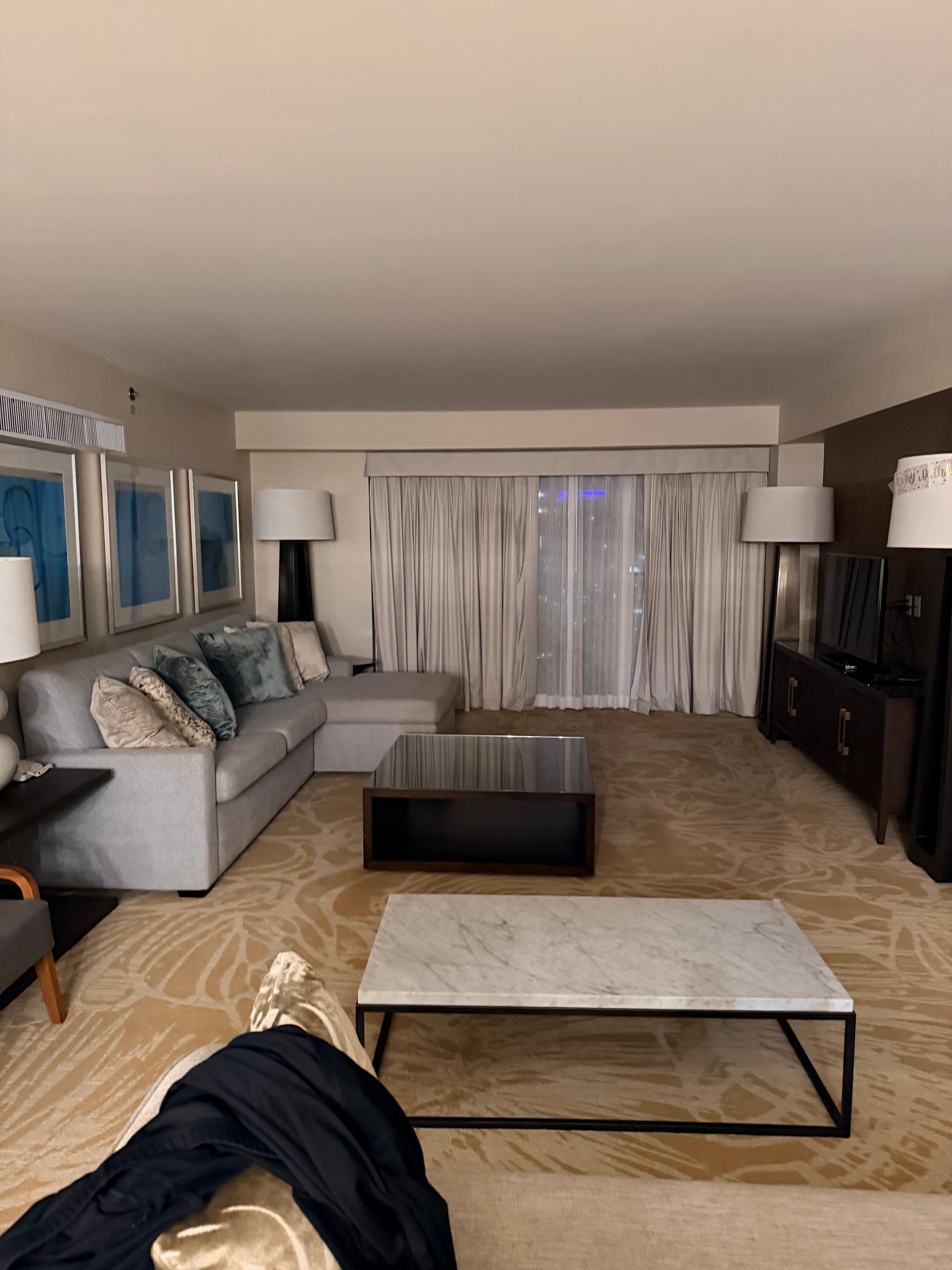 Our Regal Suite features a unique large floor plan, kitchen, dining table, and large living room. The unit features 1 King 2 Queen Beds, accommodating a maximum of 6 people. You will enjoy the panoramic views from multiple private balconies and stay connected with complimentary Wi-Fi service.