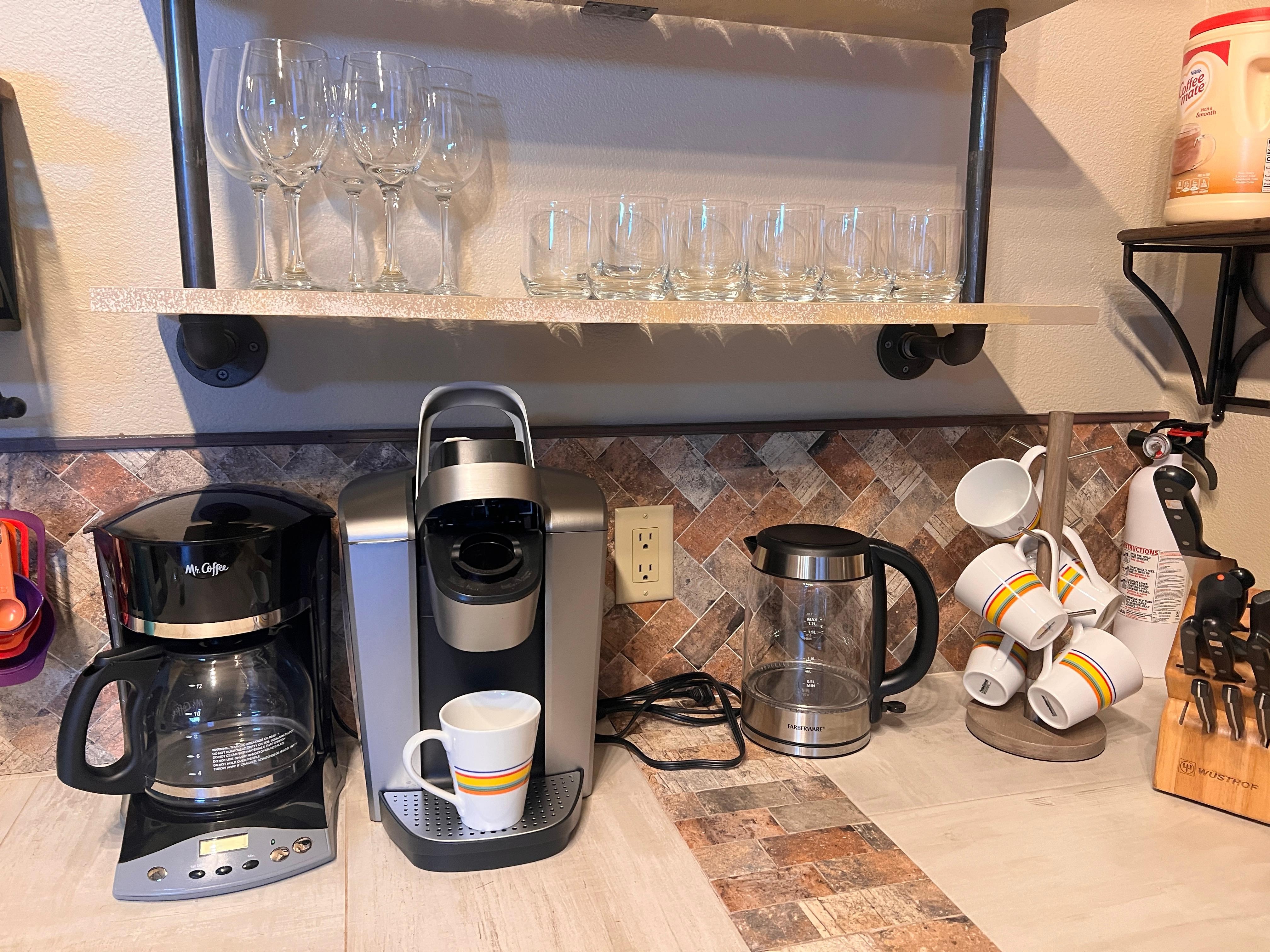- Kitchen with all major appliances including a Keurig and standard coffee maker (dish soap and dishwasher pods provided)