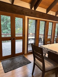 Our family affectionately calls it the “Ewok House” for its treehouse-like design: living spaces above, bedrooms below, and balconies tucked into the forest canopy. The cabin feels completely private and surrounded by nature; when we first stayed here, we realized we didn’t even need curtains. A family of deer makes regular visits, often wandering through the orchard to snack on fallen pears and apples. Over time, we’ve come to recognize them by sight and they seem just as curious about us as we are enchanted by them.