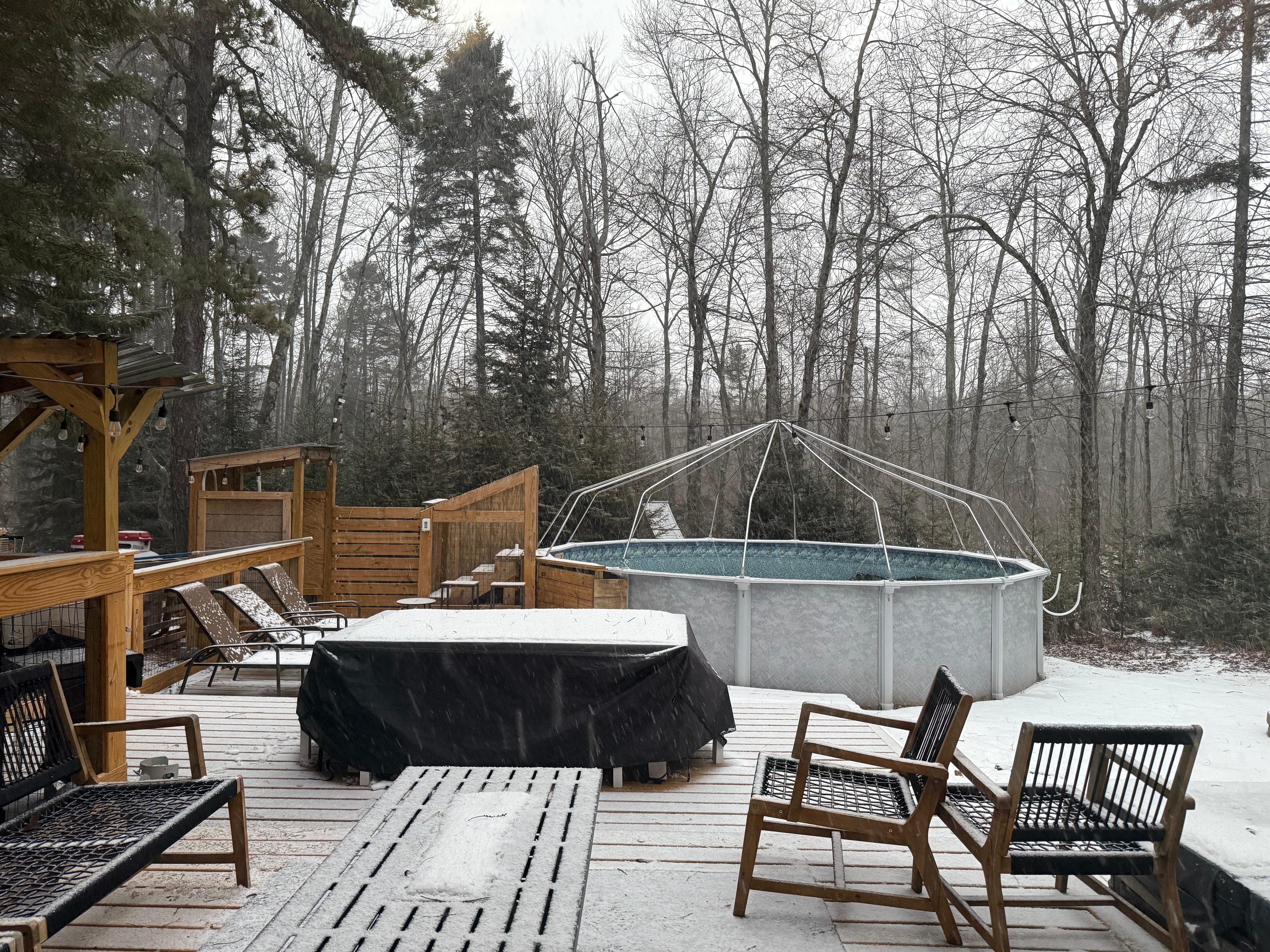 The pool features a protective done, allowing you to enjoy swimming during the cooler months. The pool will remain open until first snowfall