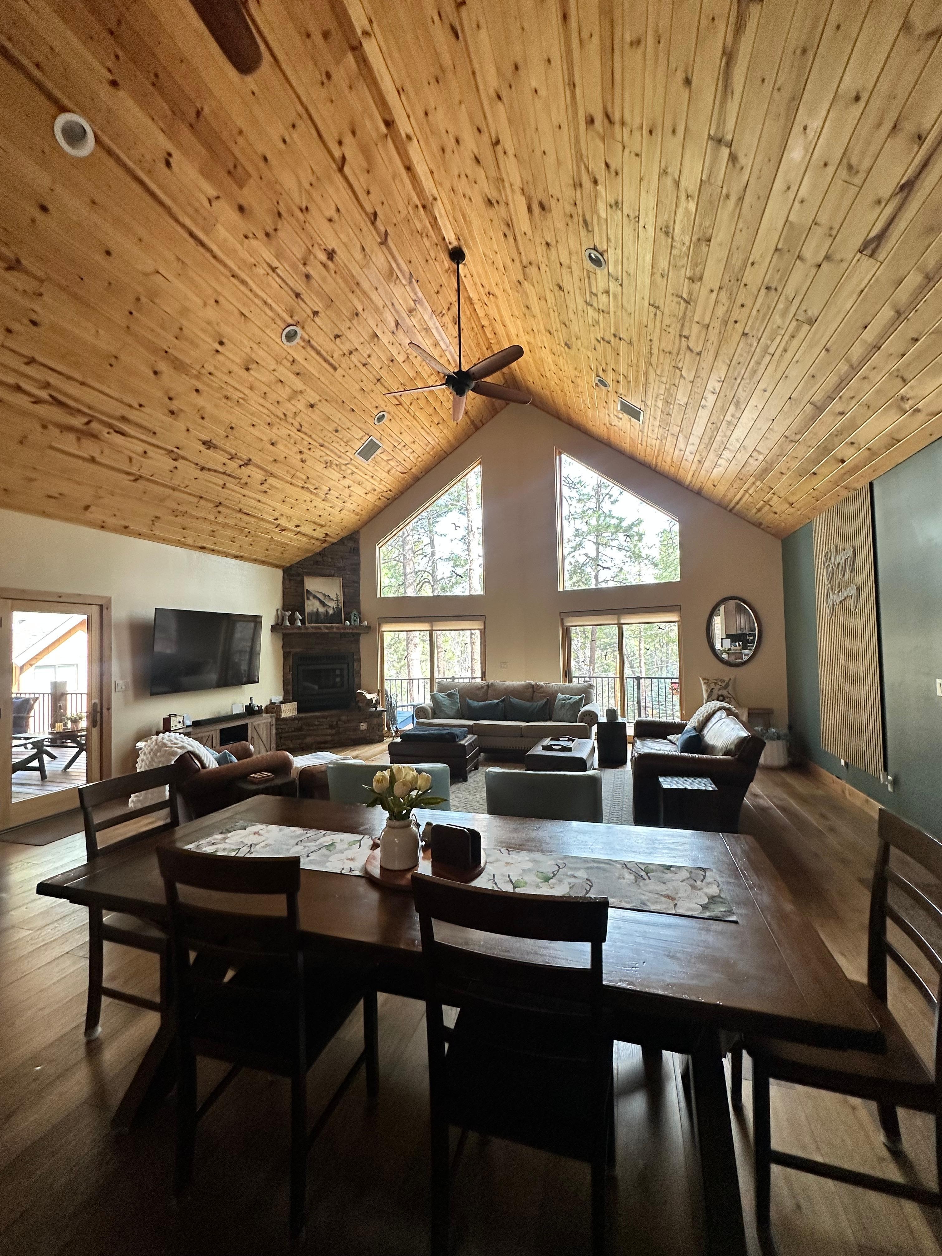 Step inside and instantly feel the wow factor: soaring ceilings, sleek contemporary finishes, and an abundance of natural light flooding through oversized windows that frame the majestic ponderosa pines. This isn't your grandma's cabin—it's a sophisticated escape with high-end touches everywhere you turn. Sink into plush leather couches by the flickering fireplace, or kick back with a movie night on the massive 75-inch smart TV. Every corner whispers high-end charm, from chic furnishings to a gourmet kitchen that’s a chef’s dream—fully equipped to whip up feasts for your crew, with dining options inside or al fresco on the sprawling wraparound deck.