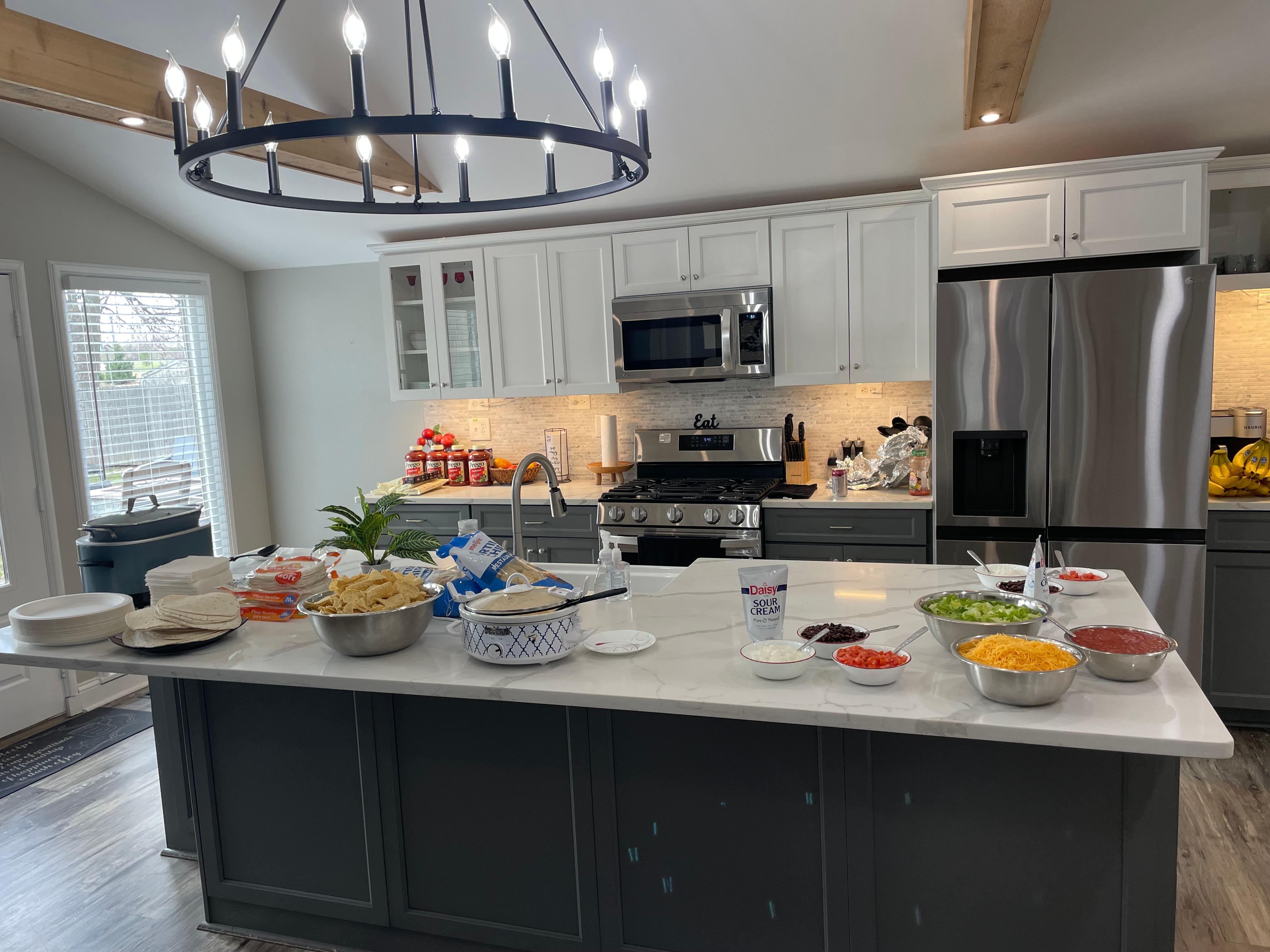 *Oversized center island w/extra wide bar stools to provide seating for 5