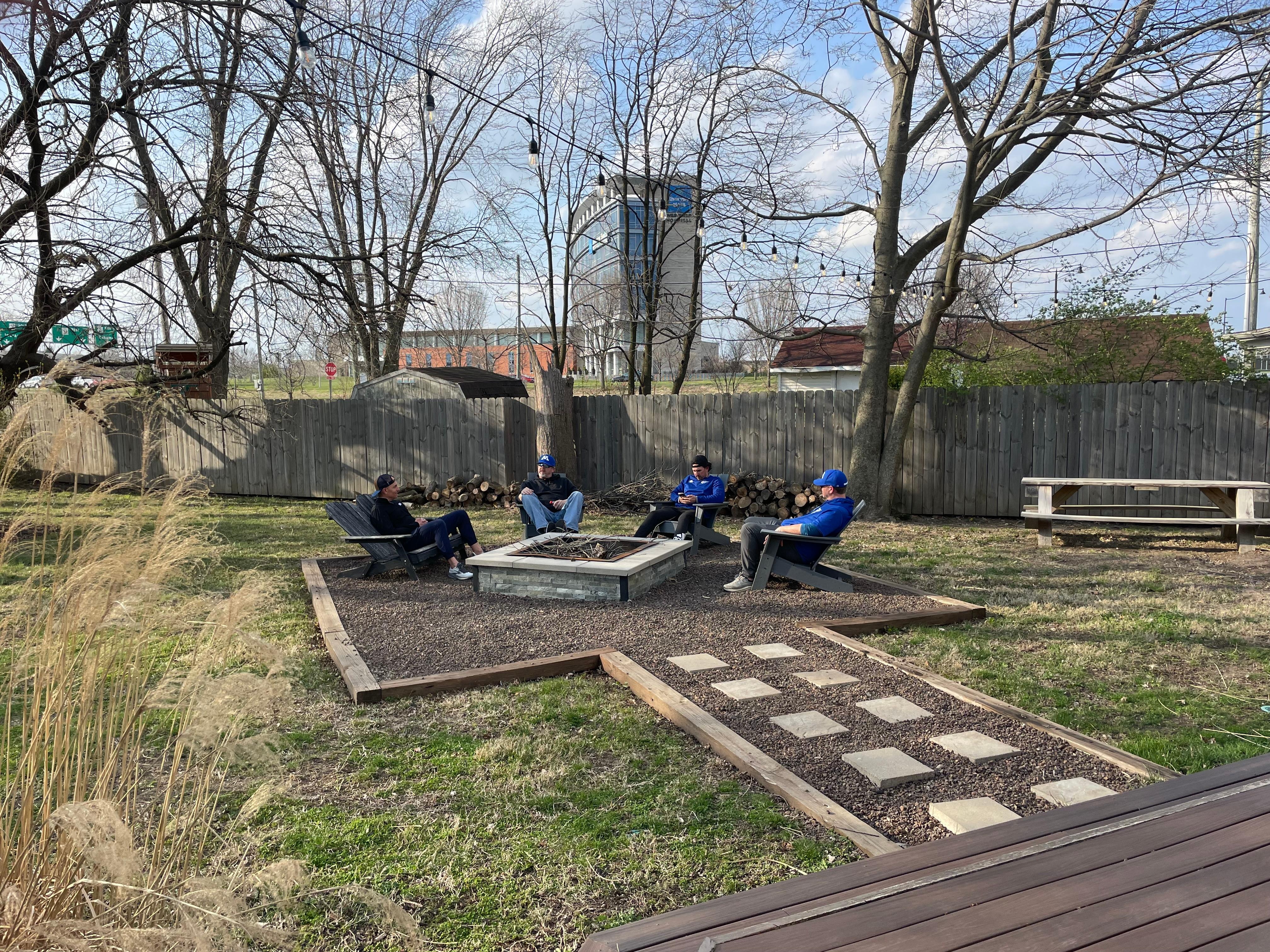 *Pebble stone walking path leading to a fire pit-complete with logs for burning, and surrounded by *Adirondack chairs; perfect for winding down of an evening