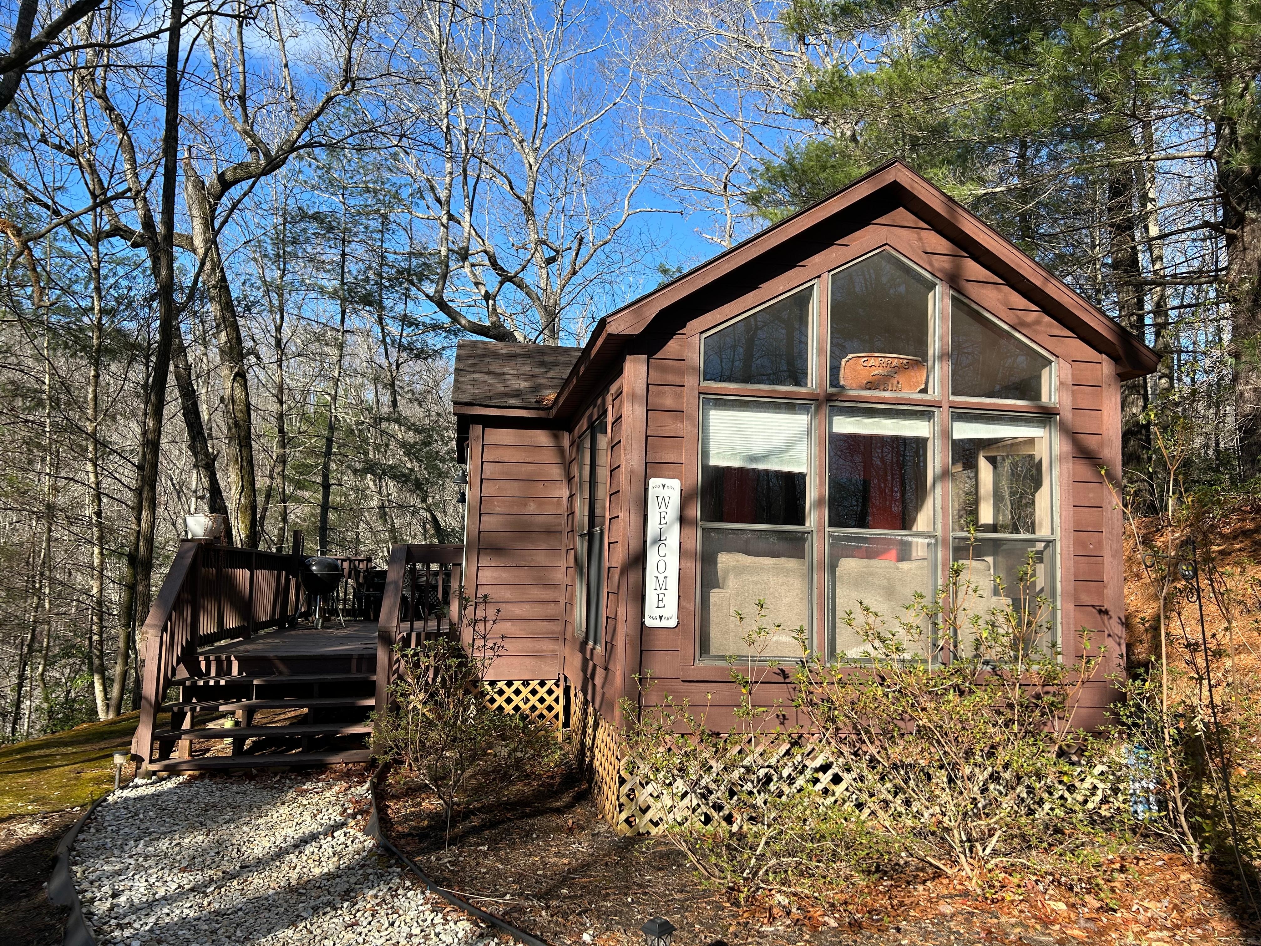 Our secluded and cozy cabin, Carraās Cabin, is one of three of our Sandy Cut Cabins options. Itās furnished with one bedroom, full sized bathroom and updated kitchen accommodations. The deck features a private Hot Tub, a grill and outdoor dining area for the perfect ending to a perfect day of exploring.