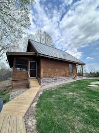 Our log cabin was completed in July of 2010 on 7.5 acres we fell in love with the first time we saw the property in March of 2009. Call 812-726-4849, check out our website turkeyhillcabinrentals. This part of southern Indiana is so unique. The view reminds us of our many trips to eastern TN. We never get tired of seeing wild turkeys and white-tailed deer walking across the front yard. Since we are a mile off the main road and at the end of the lane, no traffic passes by. Couples and families have enjoyed our cabin. With solid log construction and wood through-out, this cabin is set apart from others.