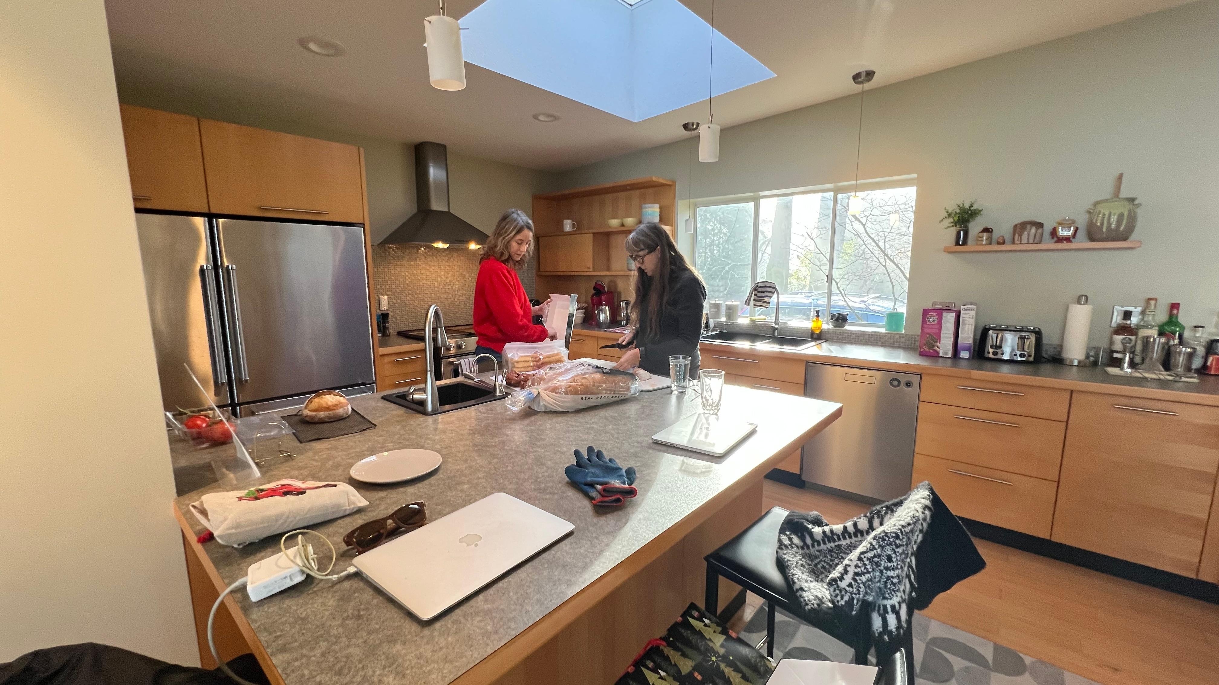 The space is designed for comfort, connection, and quiet luxury. Upstairs features an open-concept kitchen, living, and dining space with vaulted ceilings, skylights, and panoramic windows. Downstairs includes a cozy TV room, workspace, two bedrooms, and access to a second deck and yard. Bedrooms include a king suite with walk-in shower and private oceanfront deck access, a queen room, a double room, and an additional Murphy bed in the open loft.