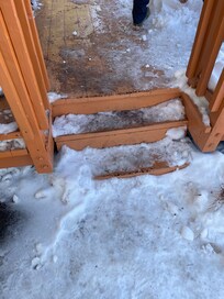 Bathroom floor at bathtub, uneven, sagging. broken hot water valve. defective door on first bedroom