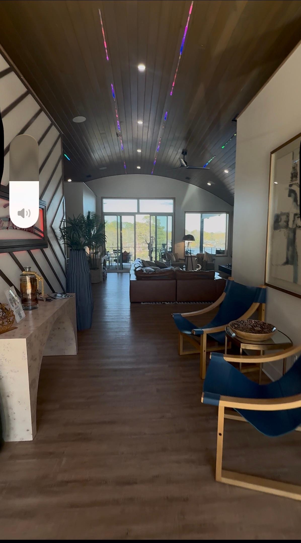 ★ ★ Living Room ★★ Step inside the welcoming embrace of this home's central gathering space, where comfort meets modern sophistication. Above, vaulted wooden ceilings and gentle ambient lighting create a sense of openness and warmth. Spacious leather sofas circle a sleek, modern fireplace, inviting guests to unwind and connect. Natural light pours in through grand windows, showcasing the natural beauty outside and leading to an inviting deck. This area is thoughtfully designed for entertainment and relaxation, featuring cozy furnishings and high-tech amenities, all enhanced by lively decorative accents. It's a space that truly stands as the home’s vibrant heart.