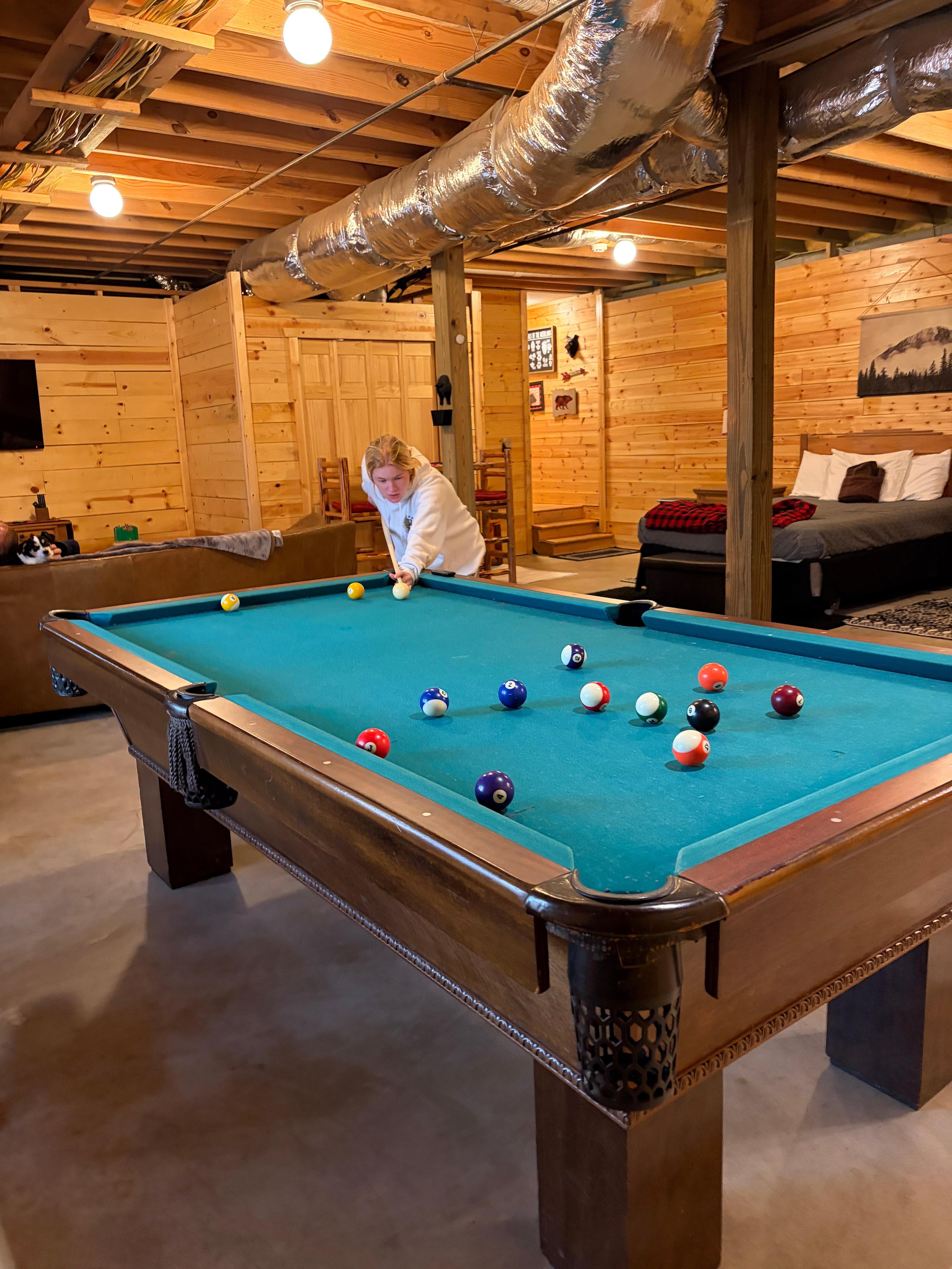 Playroom: The basement features a pool table, arcade machine, television, and additional sleeping arrangements, perfect for fun and flexibility.