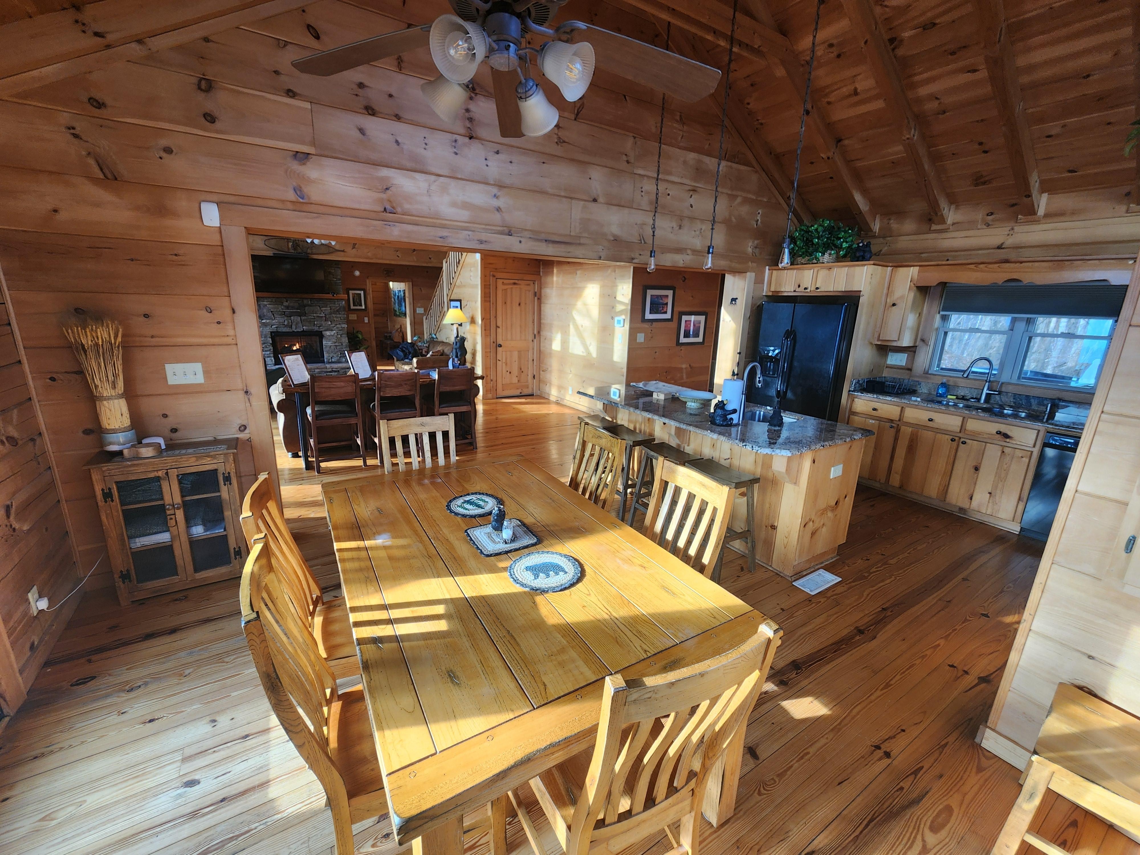 The cabin comes fully stocked with linens, hotel-size bath items, and other essentials. The kitchen is stocked with everything you need to create your chef's choice dishes on granite countertops, a central island, two sinks, an electric stove, an oven, waffle maker, and a microwave. There are three ways to make your morning coffee: a French Press, Keurig unit, a conventional coffee maker. We also have an electric kettle to make tea or hot chocolate. The dining space has a large expandable wooden table with plenty of room to dine, share stories from the day, & soak in the views.