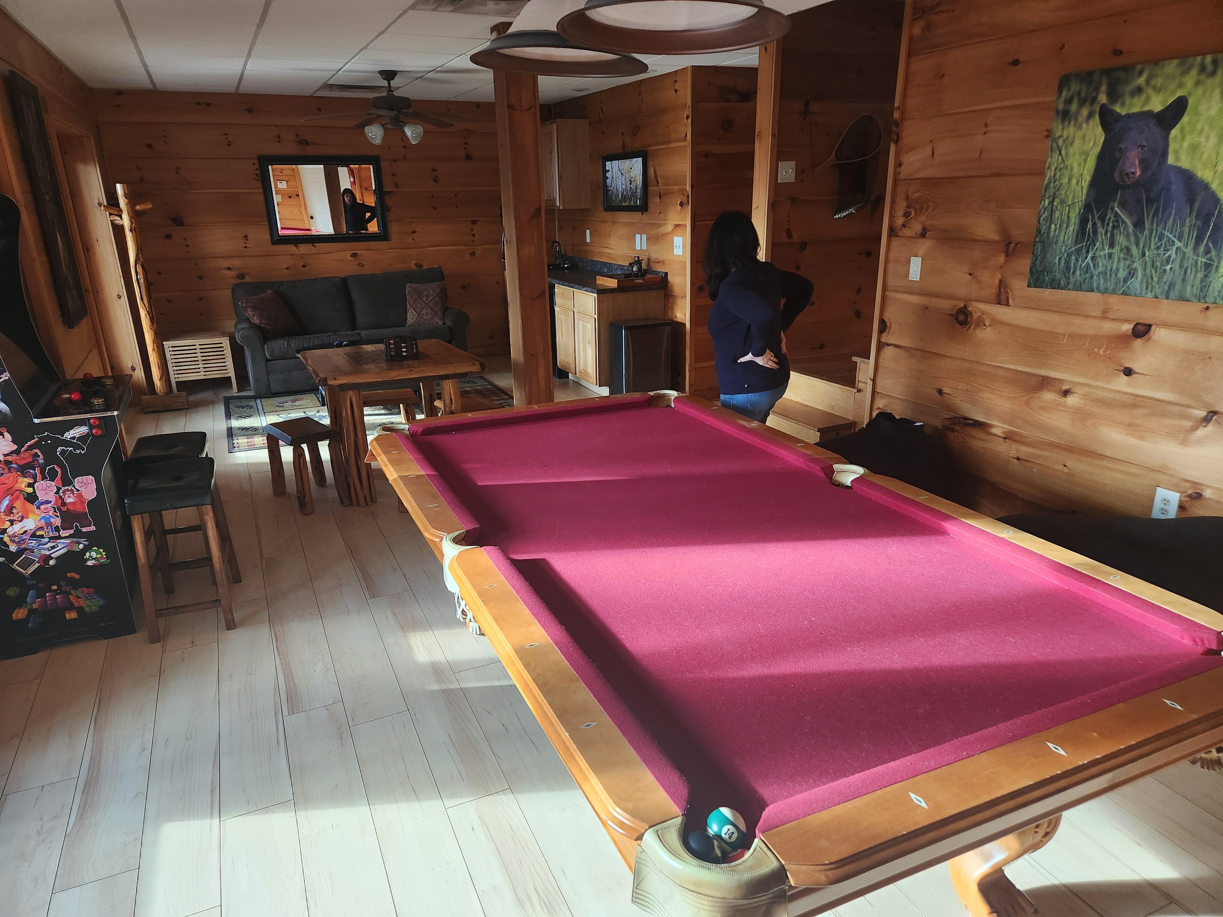 The living room is a perfect place to gather and watch a movie or a sporting event while snacking on refreshments and watching the flickering flames of the fireplace. The lower-level game room boasts a 75-inch Smart TV, pool table, lounging area, wet bar, refrigerator, queen-size sleeper-sofa, and a Legends Ultimate arcade game console with hundreds of vintage games to choose from.