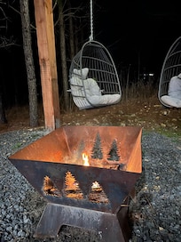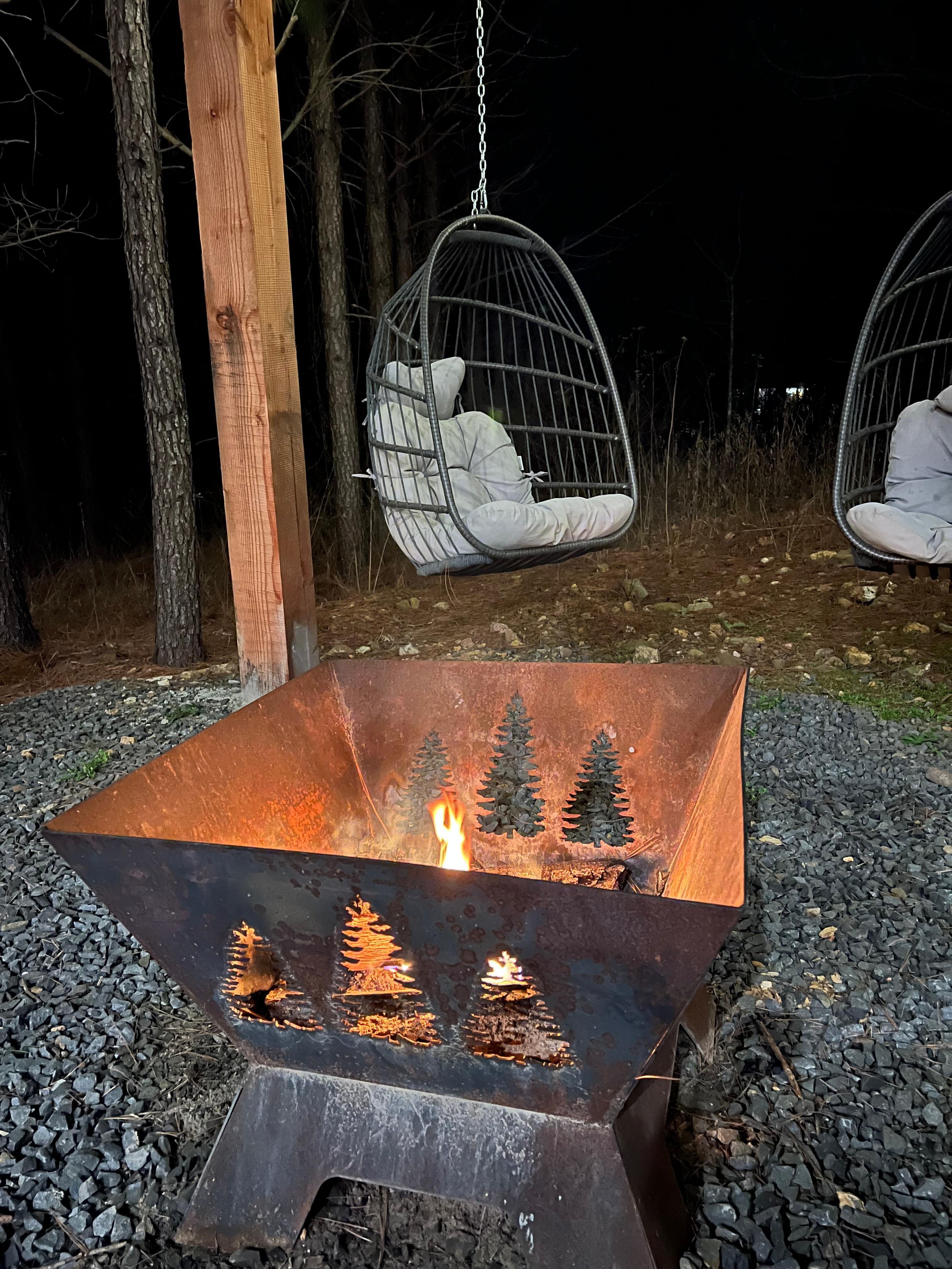 ✔ Fire pit beneath string lights with seating