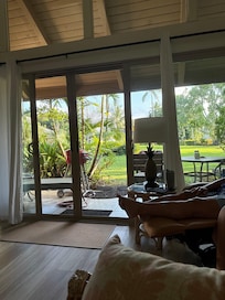 Our condo is the perfect home away from home as you discover all Kauai has to offer. This two story unit has two master suites, each with full bathrooms, and large picture windows that have a peak of an ocean view. The condo has WiFi, a 55' flat screen tv, cable. The upstairs also has a 40" flat screen tv. The kitchen is stocked with all your needs. There is an electric grill on the furnished lanai. The morning sun comes in the dining room window making it the perfect place to enjoy your morning coffee. The large stone counter and bar area is another great option for enjoying a meal. The condo is furnished Hawaiian style and has a nice breeze that keeps the condo comfortable and cool during most days. The lanai off the living area opens up to a spacious grassy area that has a view towards the ever changing mountains and skies of Kauai. Only a few units away is the pool area with Jacuzzi.