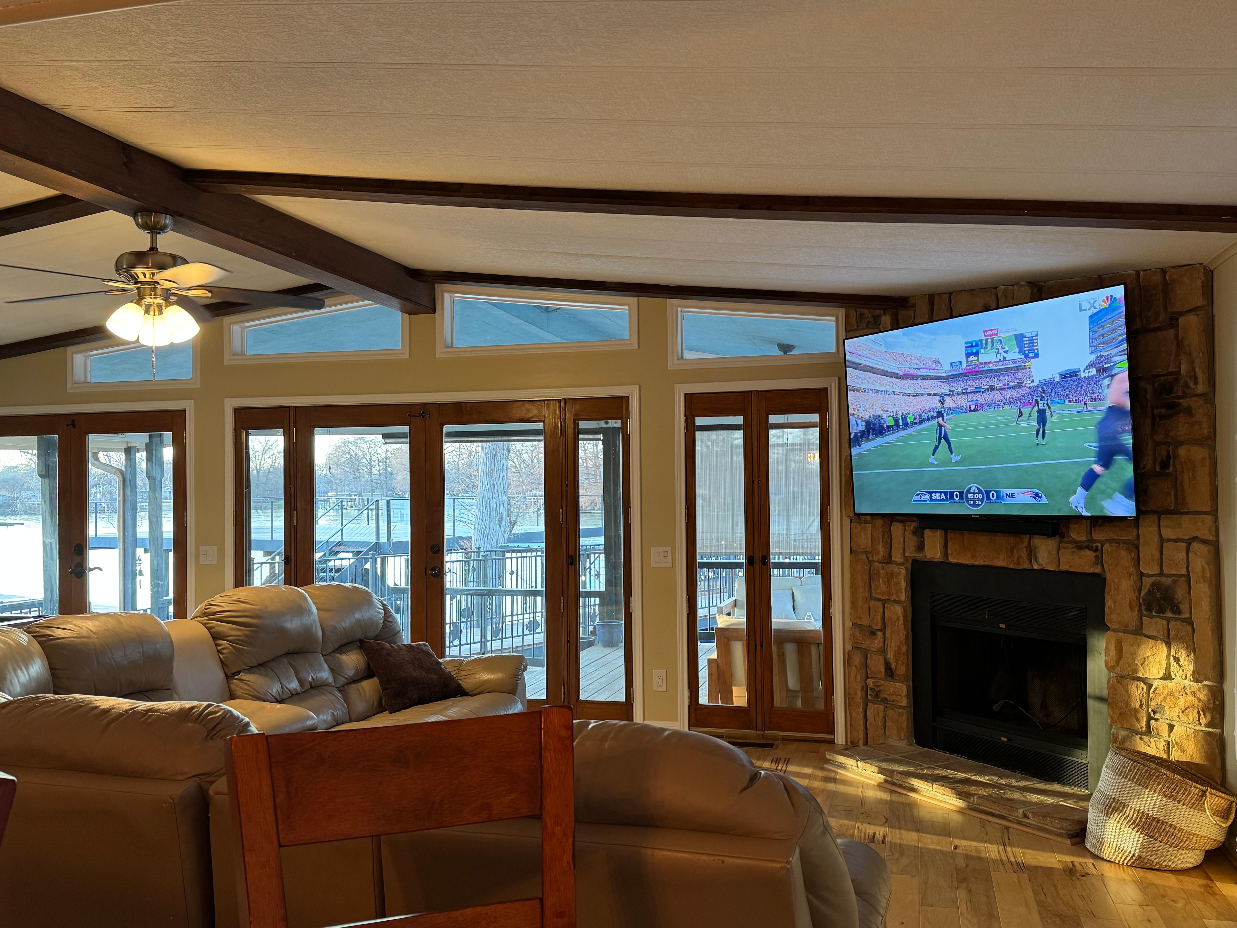 Inside, the home is just as inviting. The bright living room is filled with natural light, anchored by a large sectional sofa perfect for lounging after a day on the lake. A wall-mounted smart TV sits above a decorative fireplace, while a full-size pool table adds a splash of fun. The galley style kitchen, partially open to the living space, is well-equipped with black appliances, sleek quartz countertops, and warm real wood cabinetry. Just around the corner, the separate dining area comfortably seats eight, with a stylish coffee and cocktail station that features both drip and Keurig options to satisfy every coffee lover.