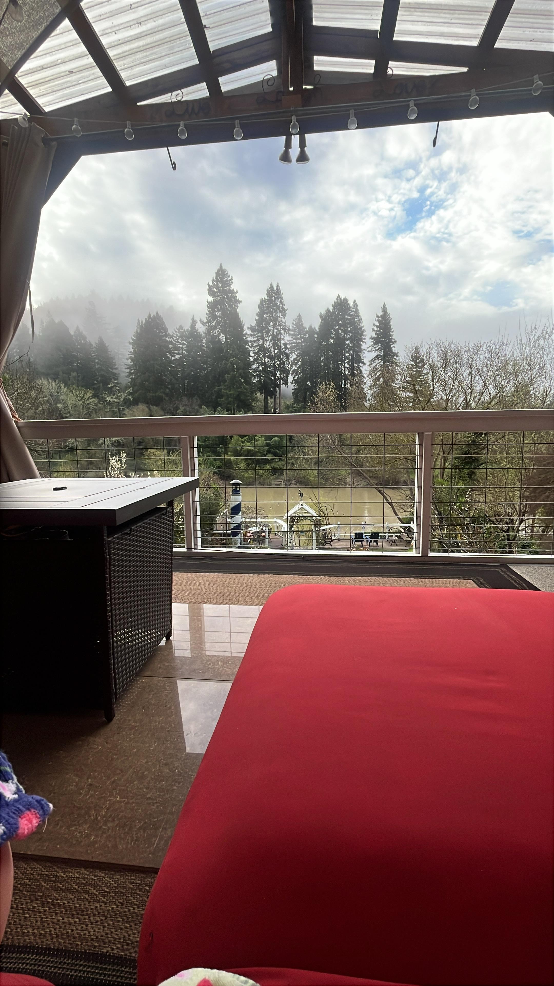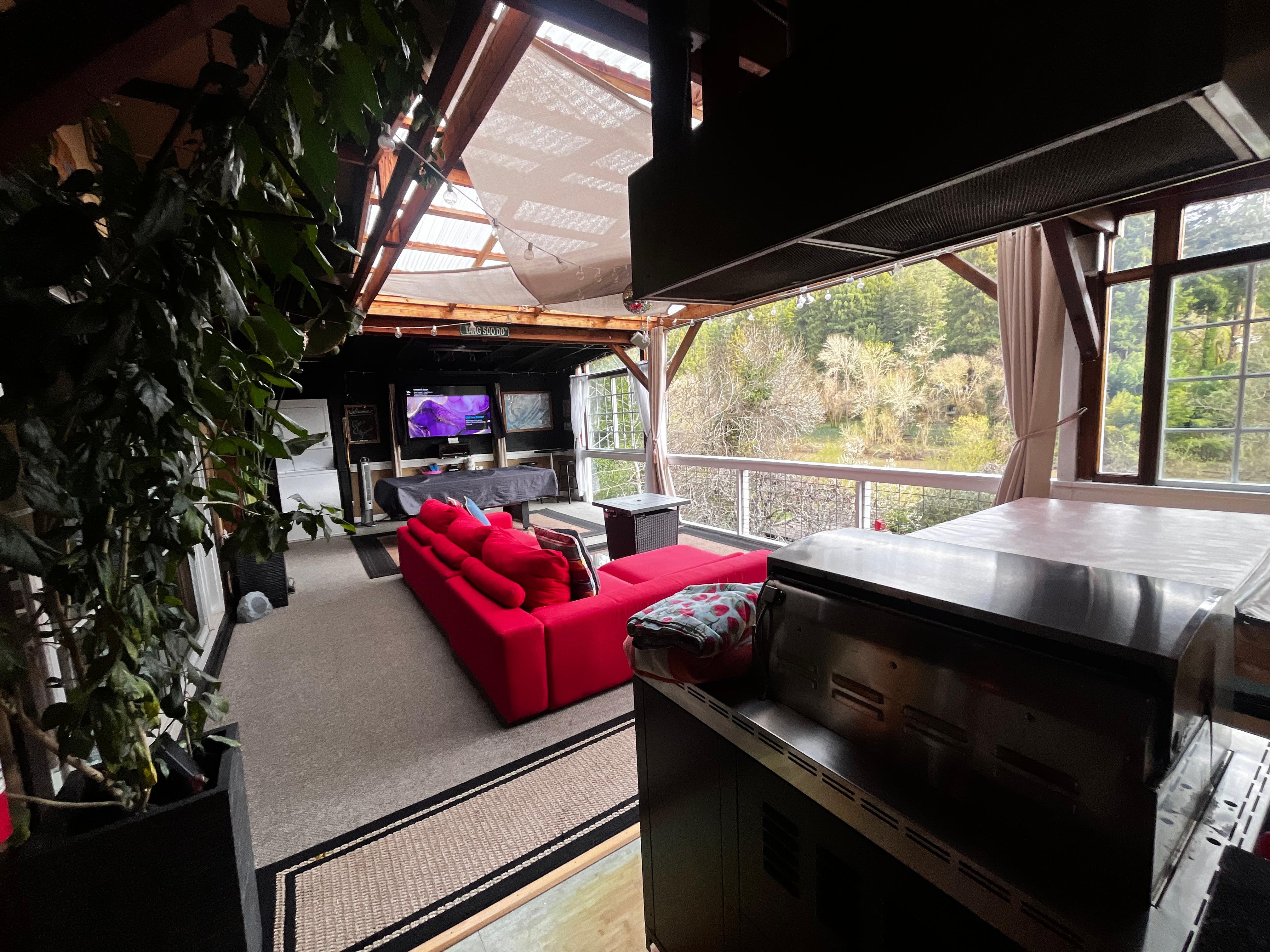 Riverscape's covered deck features sweeping views of the river, the redwoods, and the lush backyard. Experience luxury outdoor living complete with a 6 person hot tub; an outdoor kitchen with a bar, sink, large gas BBQ, and prep area; an outdoor living room with couches, a 50' HDTV with Directv and surround sound, dvd player, a pool table/ping pong table, and a washer and dryer. On chilly evenings, you can light up the outdoor heater, and close the canvas curtains to keep snugly while listening to the river slide by.