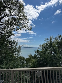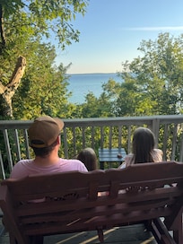 This cottage is the perfect retreat for the family. Located on a bluff just above Lake Michigan. The huge oversized upper and lower deck are a great place to relax, dine, enjoy the view, and listen to the sounds of Lake Michigan and the forest. The wide staircase down to the cabin provides a quiet secluded home without view of neighbors. The cottage is on a bluff above the lake.