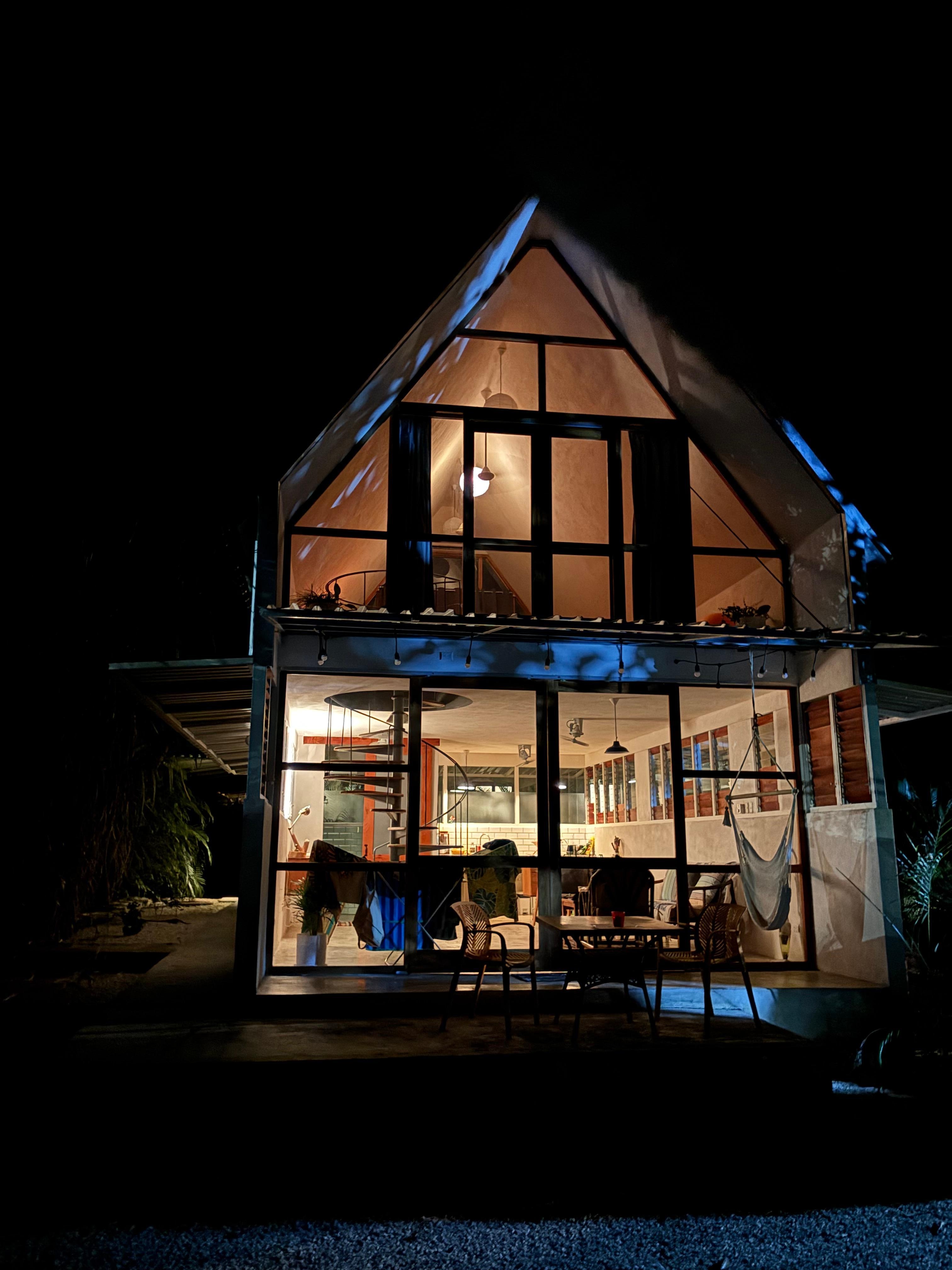 Tato is a dreamy A-frame hideaway, where modern style meets the magic of the jungle. Step inside to discover a cozy living room, a nearly full kitchen (just missing an oven), a sunlit terrace, and a refreshing shower on the main level. A graceful spiral staircase winds its way up to a lofty bedroom retreat, complete with a sitting area and writing desk. From the grand A-frame windows, treetops stretch out before you, creating the feeling of a secret nest in the canopy. The king-size bed is perfectly placed for lazy mornings and enchanted evenings, inviting you to drift away while gazing into a sea of green.