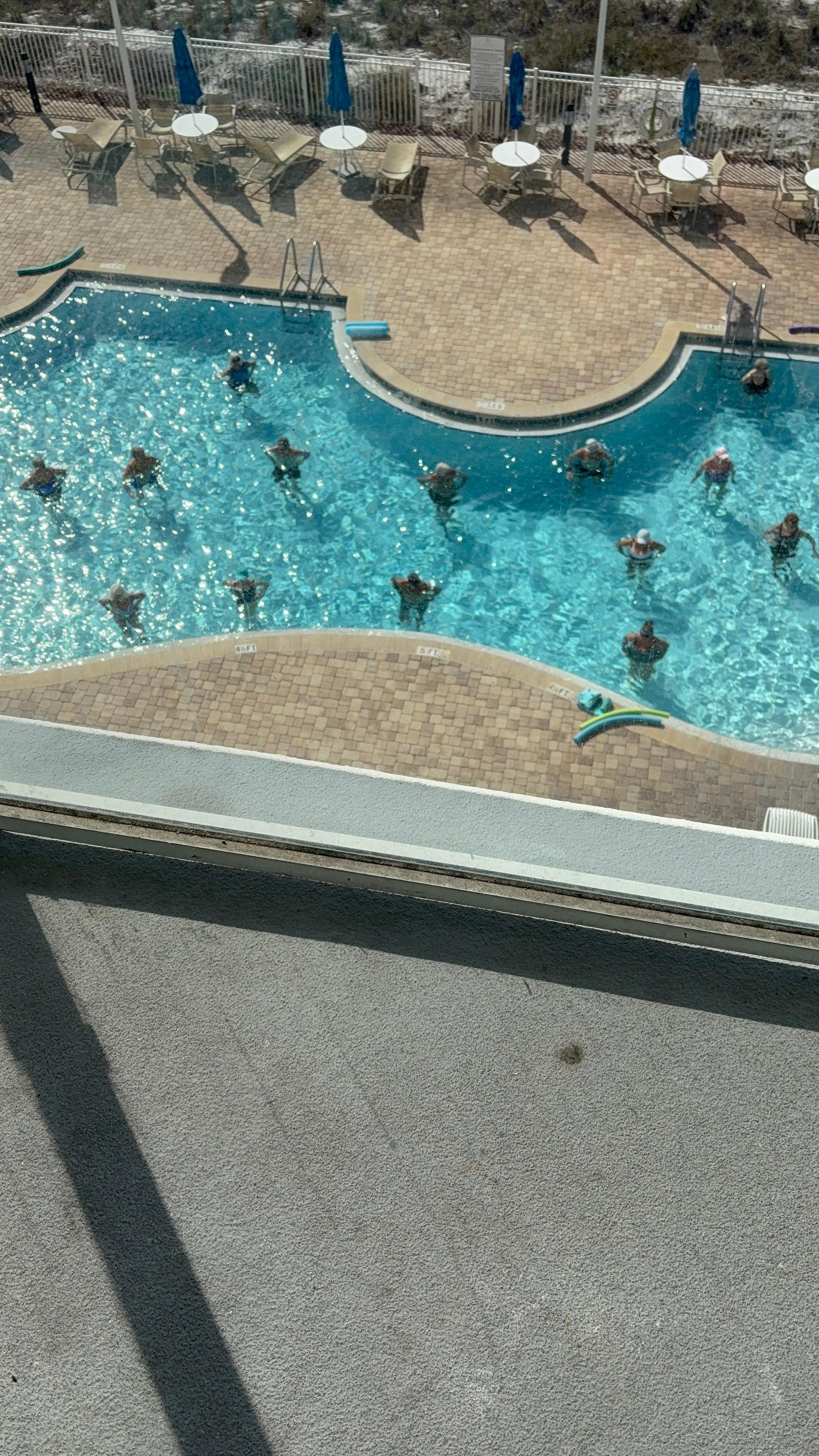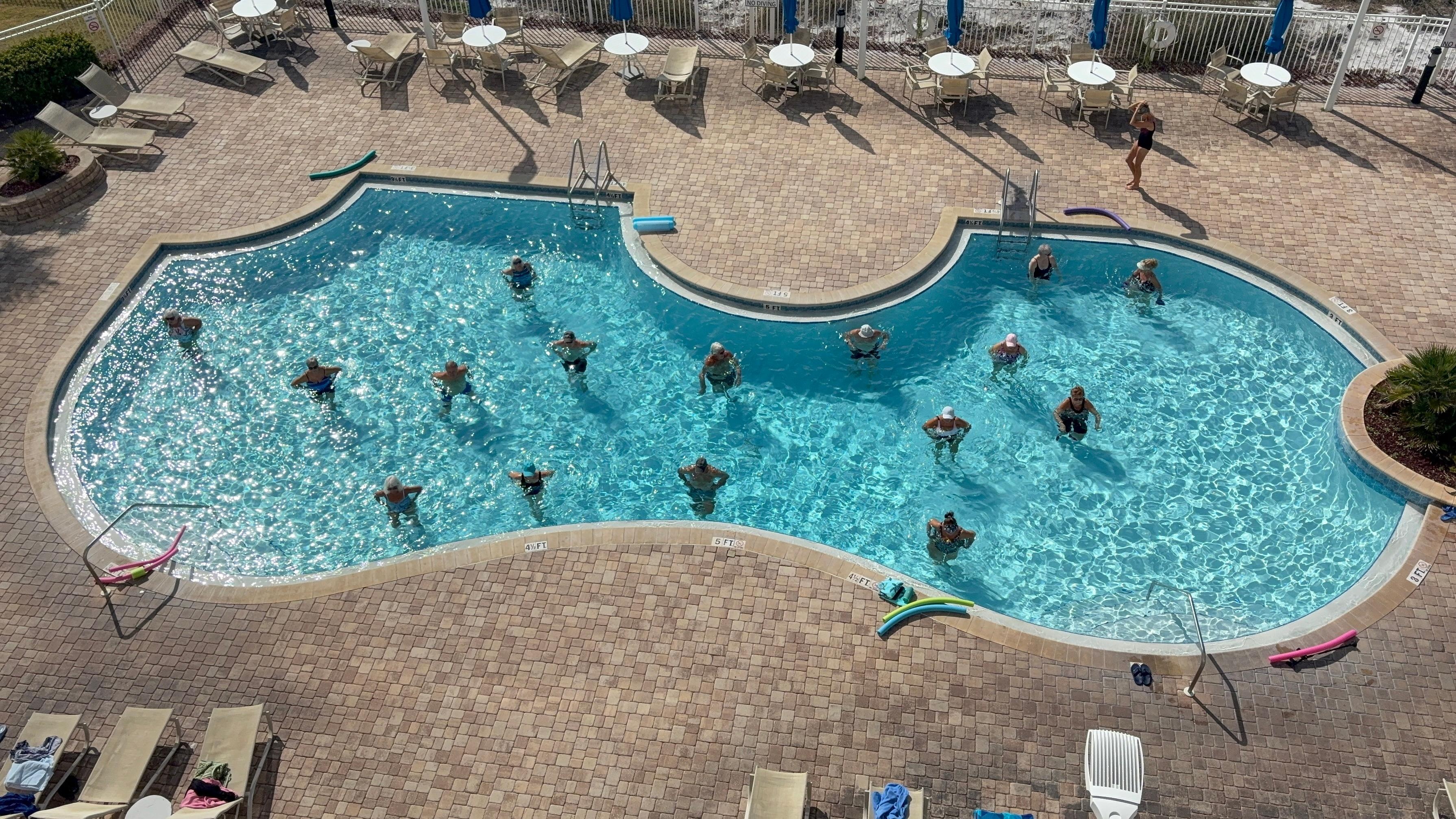 Watch dolphins on the comfortable, easy to move around lanai furniture (can even put portable table on Lanai for breakfast!) from this beautiful 4th floor perspective-not too high so you can't see the beach, not too low so people can see in. There is a fitness center and the pool is heated to 87 degrees year-round.