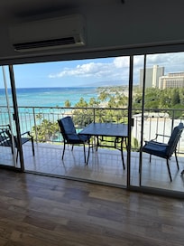 ā Large, ocean-view lanai/balcony with table and chairs
