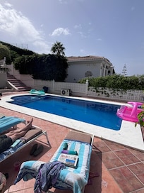 Attractive Villa set within a 5 min walking distance to nearest beach,Niza Beach, Torre Del Mar is our local town and is a ten minute drive away. Furnished to an exceptional high standard throughout. All rooms are on the same level. Villa is South Facing and enjoys many hours of sunshine throughout the day. it has three bedrooms two double and one twin room, one full bathroom with bath/shower and one bathroom with shower, kitchen has washing machine and dishwasher, linen is provided air con units are in living area and in two double bedrooms Free wifi is included enjoy attractive landscaped gardens in the comfort of sun loungers and outdoors dining furniture including gas barbecue which take in the surrounding of large outdoor swimming pool, the third floor reached by spiral staircase is another patio area used for sunbathing with great views of the sea