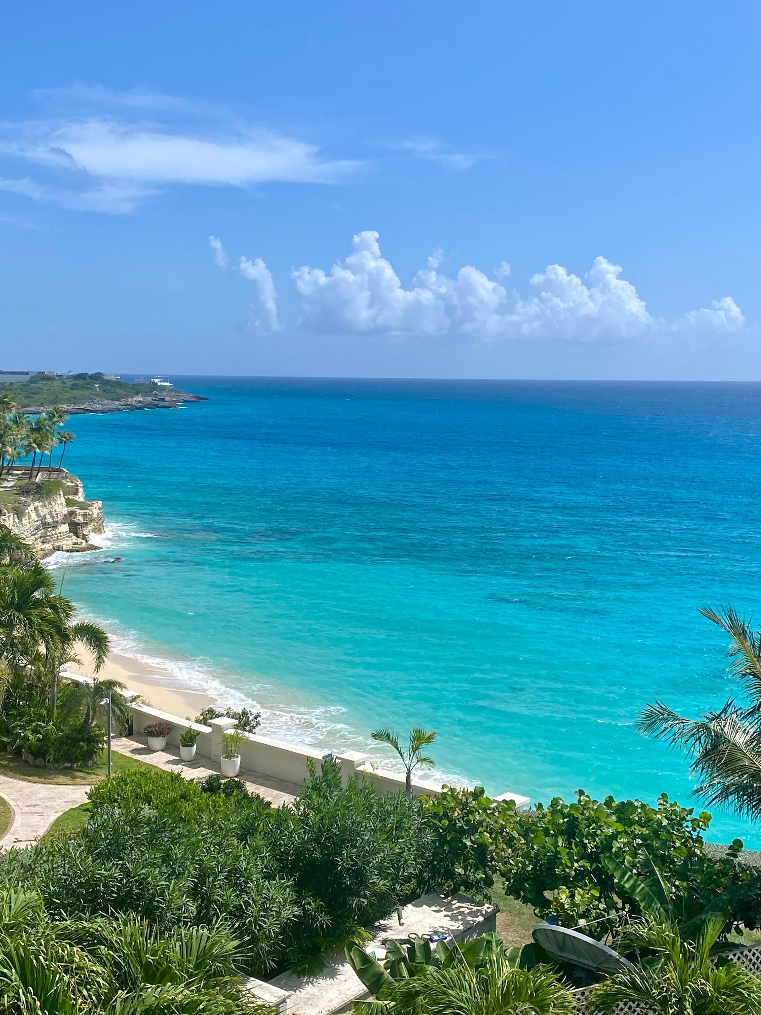 Experience a new dimension of luxury oceanfront vacation. Breathe the Ocean, live the Ocean. Place yourself high enough to see its endlessness, yet close enough to feel being embraced by its power. This property is a jewel of Cupe Coy, the top location of the island. Major upgrades are made to meet guests' wishes including new (Nov 2023) 65" Samsung 4K TV, Netflix Premium (4K) subscription, new Italian furniture, new premium pocket-coil mattresses, large LG fridge (July 2023 upgrade) , new DeLonghi espresso machine, new AC, microwave oven, washer, dryer, fans, etc. There are two independent AC units but they are really not necessary in this apartment that is never heated by direct sunlight and constantly cooled by ocean breeze flowing through every room. Instead, you can open terrace doors wide and enjoy sounds and smells of the mighty ocean presence in your bedroom all night long. On the terrace, be amazed by the panoramic ocean view with huge cruise ships, yachts, catamarans, island of Saba, etc. On certain days, you may see St. Eustatius and even St. Kitts on the horizon. You can also enjoy ocean view from the spacious living room, fully equipped kitchen/bar, master bedroom, vanity room with two sinks and even from the master bathroom.