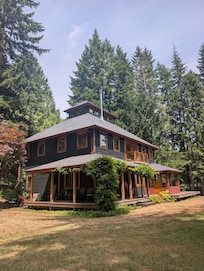 A custom built home on the end of 3/4 mile of gravel country road. Beautifully finished yet very comfortable. Centrally located in North Kitsap County. House is on 8.5 private acres that is a very nice mix of open sunniness and forest. There are porches both covered and uncovered. Large yard with a fire pit and room for outside games. Interior is 2400 feet of comfort. Well equipped full kitchen with dinning room. There are 3 bedrooms upstairs, 2 with king beds and 1 queen in the master bedroom. The first floor has 1 bedroom with a double bed. There are 2 full baths, on the second floor, one in the master bedroom with a shower and claw foot tub, one shared with a shower tub combo. The first floor bath has a claw foot tub. House is not child proofed.