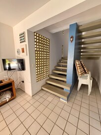 No térreo um quarto suíte com ventilador e banheiro privativo, e um banheiro social na sala, confortável sala de estar, sala de jantar, cozinha e dependência de serviço.