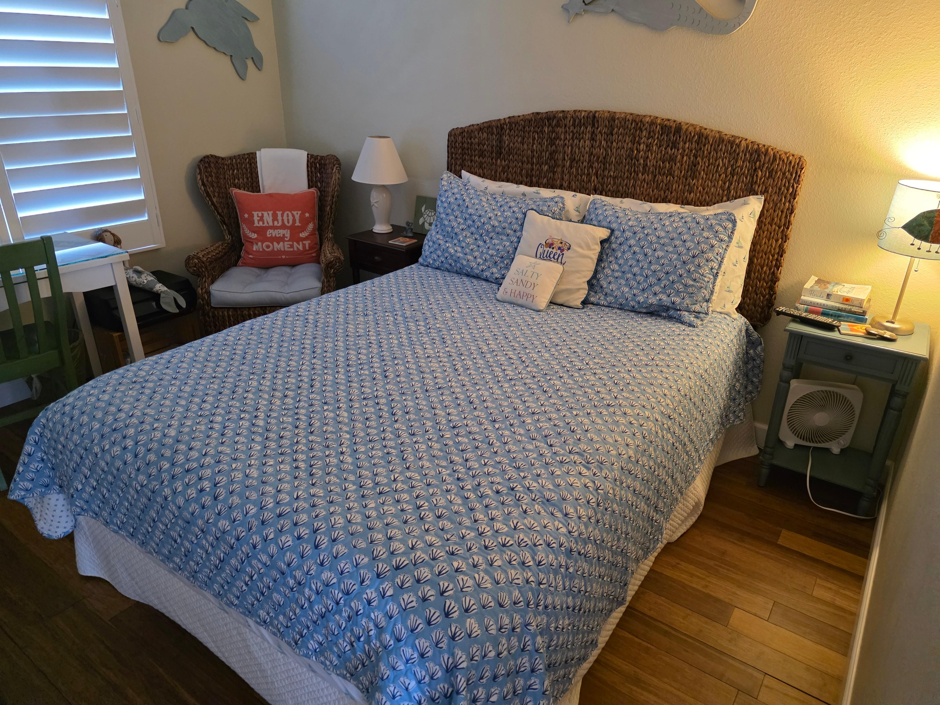 Upstairs are two bedrooms with bamboo wood flooring and ceiling fans, as well as a full bath. The master bedroom has a king-sized bed and a private screened balcony overlooking the Gulf of Mexico. The guest bedroom has a queen-sized bed, a small desk and a sitting chair. The guest room window looks out to the intracoastal for beautiful sunrises.