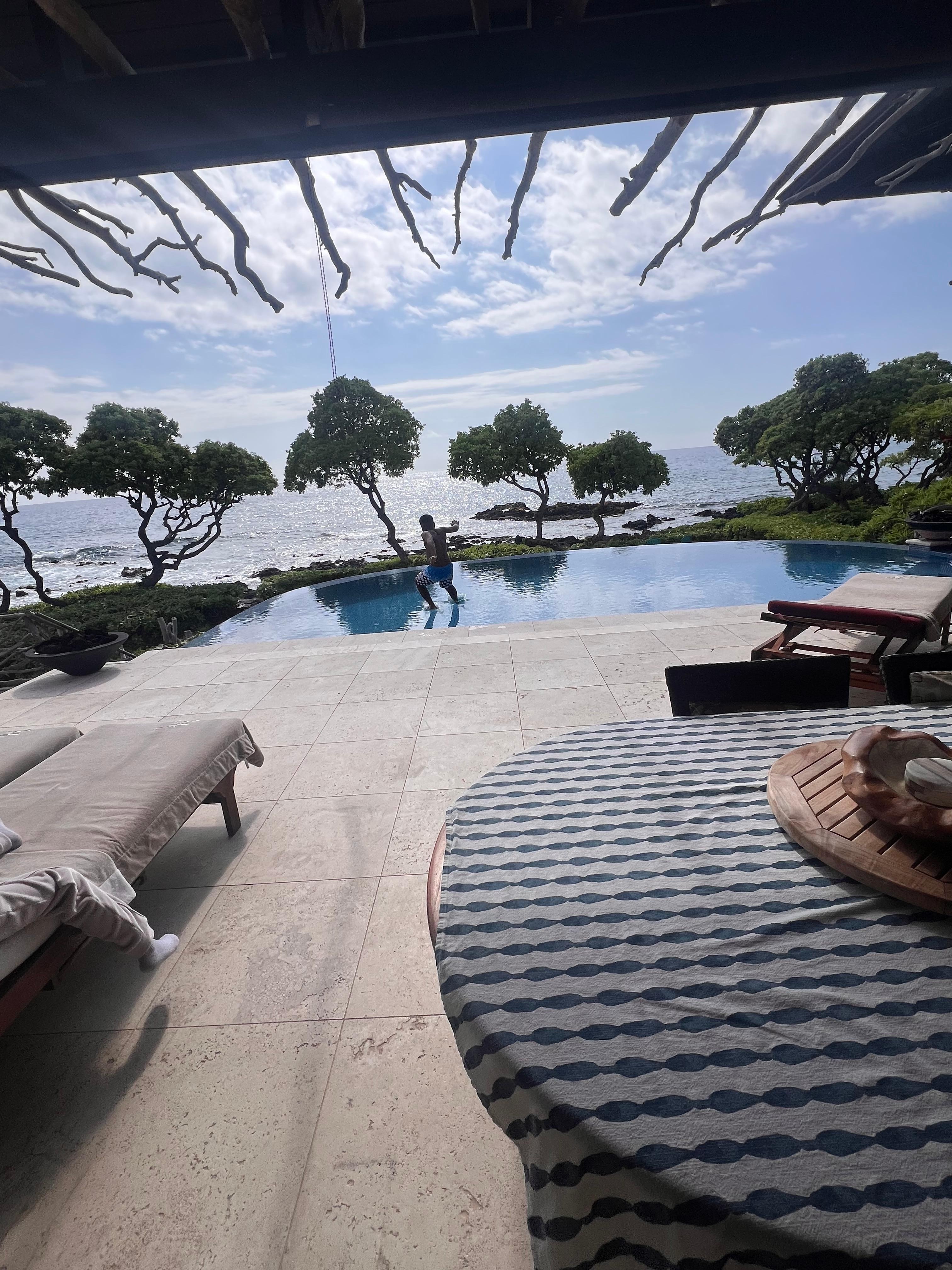 Boasting high ceilings, a gourmet kitchen, and a spacious patio with a pool and hot spa jacuzzi just 40 feet from the ocean, the home comfortably accommodates up to 8 guests. The master bedroom features a king-size bed, a walk-in closet, a spacious shower, and a soaking tub. Three additional suites offer the same style and luxury, complete with Ohia wood accents and private bathrooms.