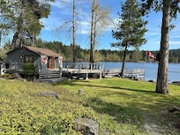 Totally updated 3 bedroom home situated on a 1.2 acre lot surrounded by 400ft of waterfront. Spectacular water views from all primary rooms plus a 700sqft deck off the main overlooking the lake. Docks, moorage and a cozy beach house with french doors at the shoreline.