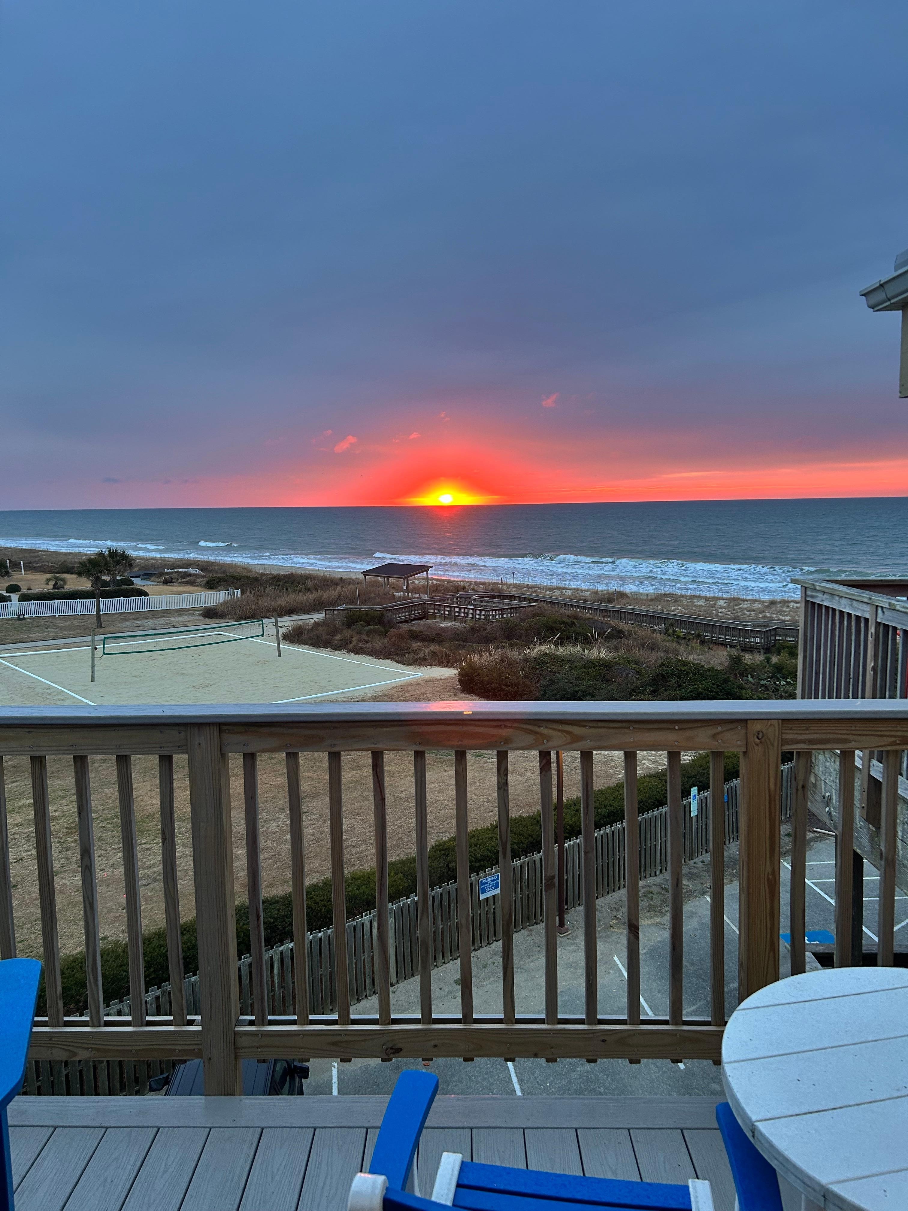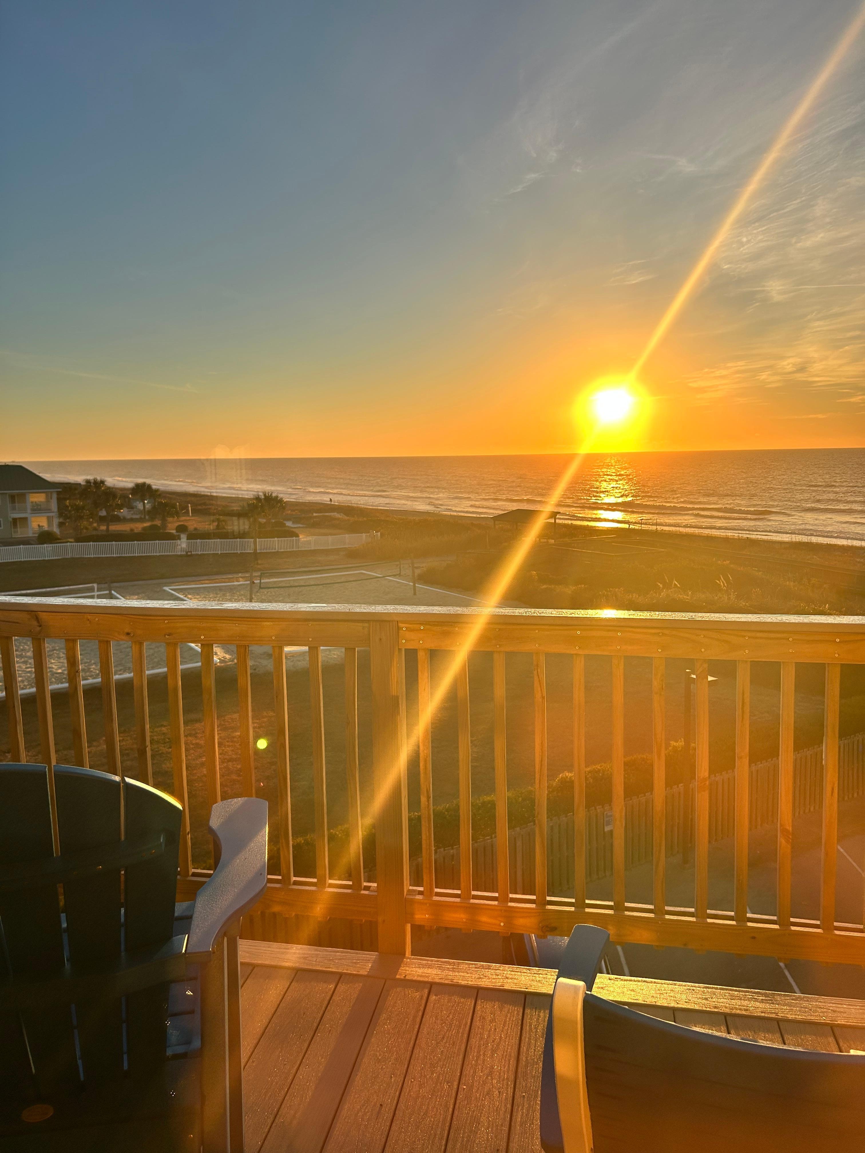 "SweetWater" (1302 Queens Court) is a completely renovated oceanfront 1 bedroom, 1 bath, top floor Queens Court condo that boasts some of the best views in the complex and is located on the sunrise/beach access side of the oceanfront building. This unit is beautifully decorated, thoughtfully appointed and has many custom upgrades. "SweetWater" features custom cabinetry and granite counter tops, a tiled glass and stone mosaic wall in the kitchen, mirrored walls that reflect the beautiful ocean view, a dining area for 2, bar seating for 3, porcelain tile floors throughout, a comfortable living room with a 50" Smart Roku TV and a BluRay DVD Player with Streaming capabilities. A Queen size 6" memory foam floor palette is available for additional sleeping. The bedroom has a firm King size pillow top mattress, a 40" Smart Roku TV. The bathroom has a step over tub/shower combo. Start your day by enjoying the beautiful Emerald Isle sunrise from the deck off of the living room, then go down to the beach and relax. The elevator and easy walkway with ramps to the beach are just steps away! No stairs at all to navigate! Come and enjoy all of the comforts of home at "SweetWater"!