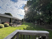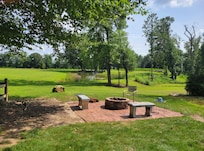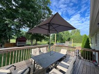 OUTDOOR LIVING: Deck w/ umbrella-covered dining table & seating, lower patio w/ gas grill, seating, dining table & standing heater, fenced backyard w/ kids’ playhouse & toys, sandbox, patio w/ cornhole & basketball hoop, fire pit (wood not provided), shared fishing pond w/ fountain (catch & release), fishing equipment (available upon request)