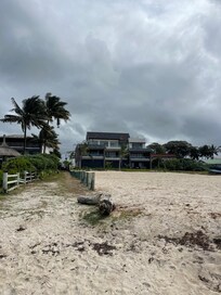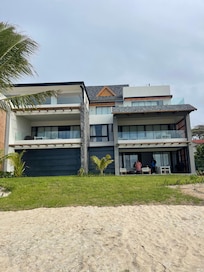 LĂ€genhet vid en vit sandstrand med utomhuspool