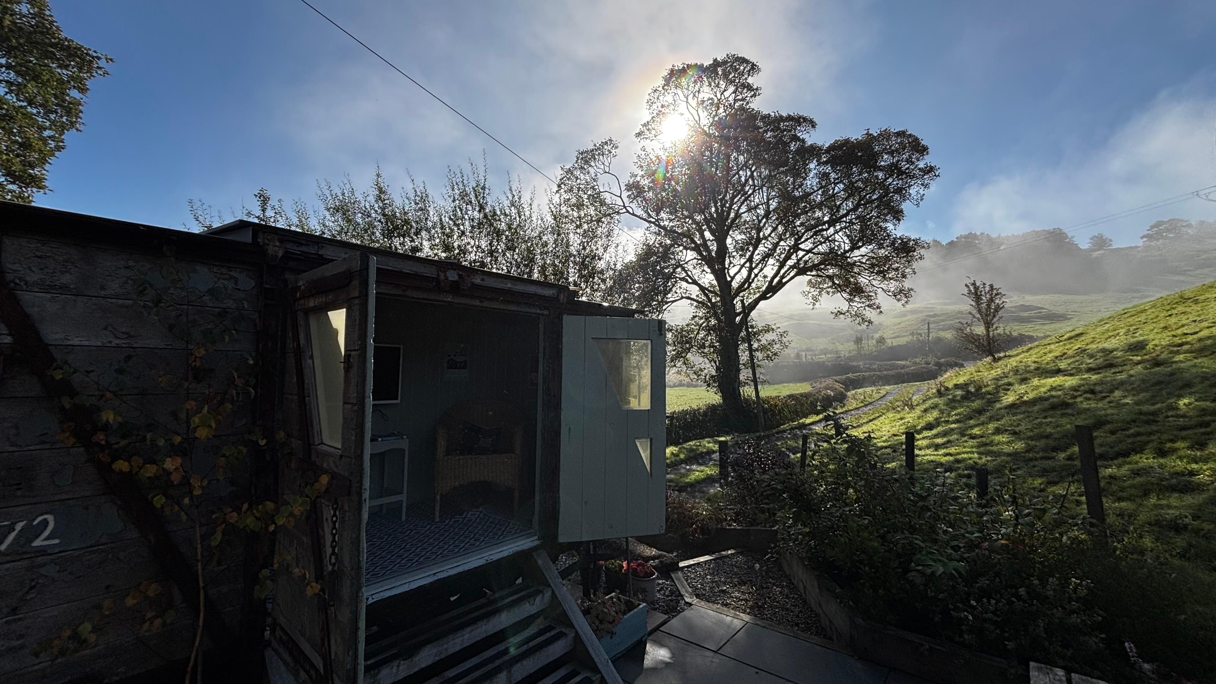 It is a former 'beudy' ( cowshed ) from the time when the house used to be a farmhouse, so it has a high beamed ceiling and is full of character. It makes a comfortable, affordable and convenient base for couples or solo travellers. The patio, with wooden dining bench and railway carriage garden room, is a lovely place to relax with a glass of something (or hot chocolate depending on the season!) after a day out in the mountains. Being south facing, the patio gets the sun well into the evening during the summer months.