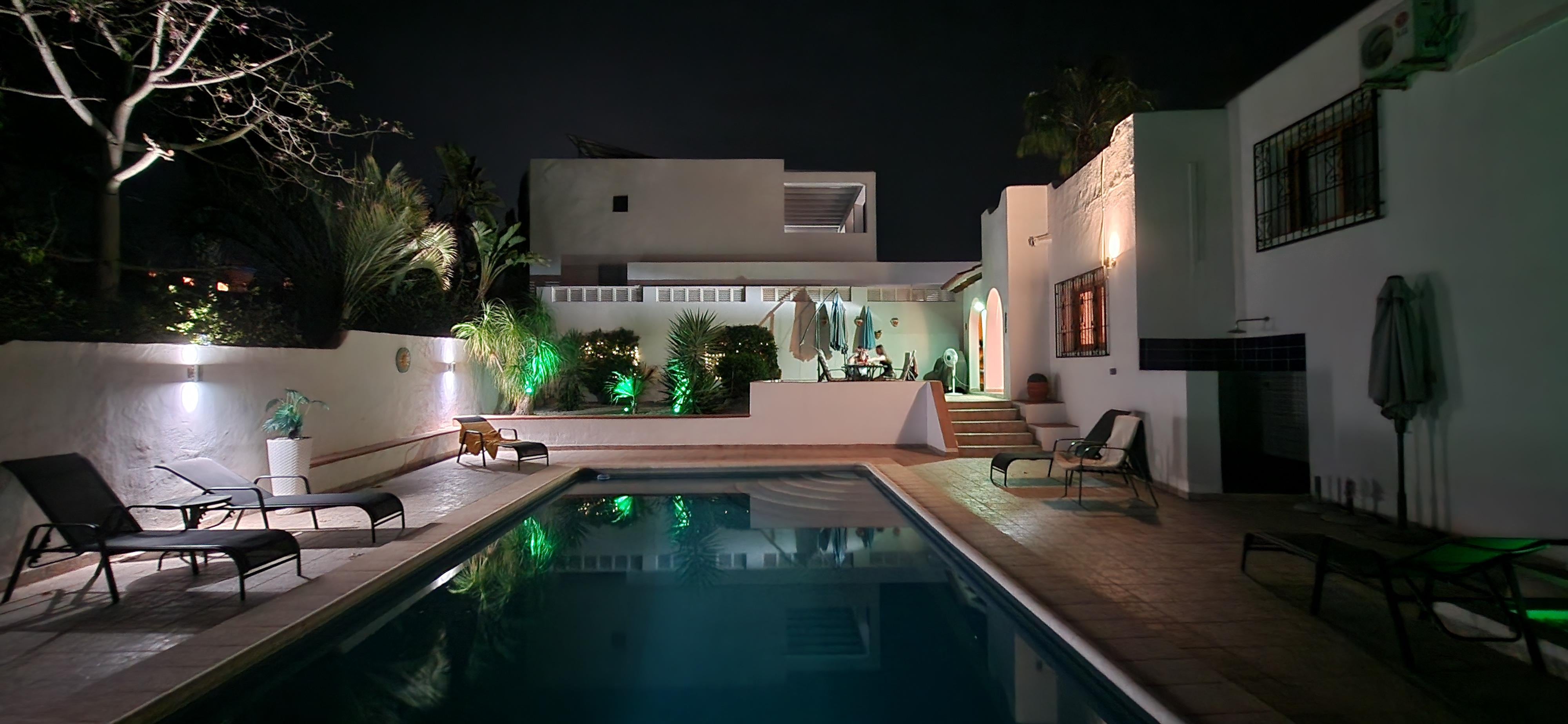 At night the garden is lit with fairly lights on the palm trees and there are wall lights that give the garden and pool area a magical effect