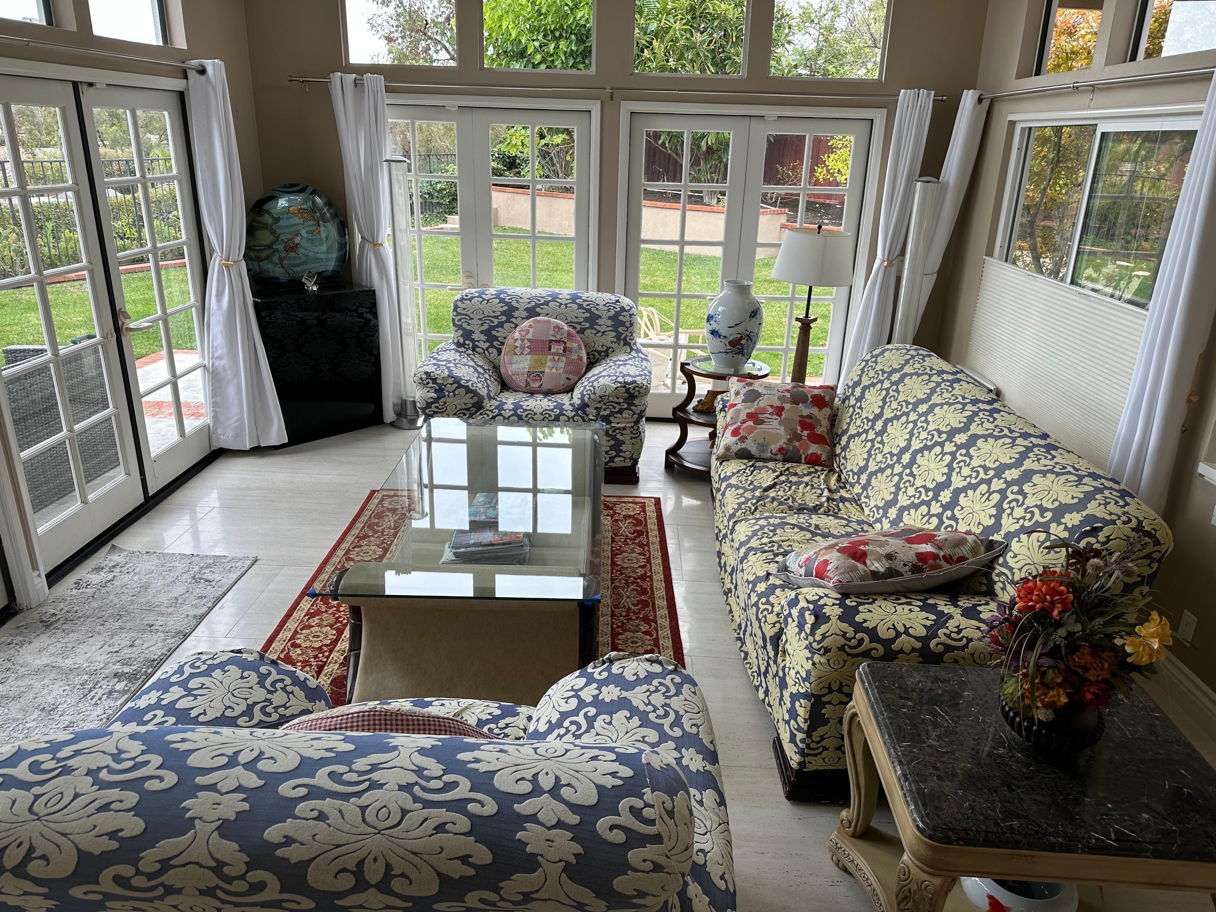 Det stora ljusa vardagsrummet utanför det tvÄ vÄningar ingÄngen till hemmet har franska dörrar som öppnar sig till trÀdgÄrden och en uteplats för att förverkliga den inomhus / utomhuspotentialen i Kaliforniens levande.