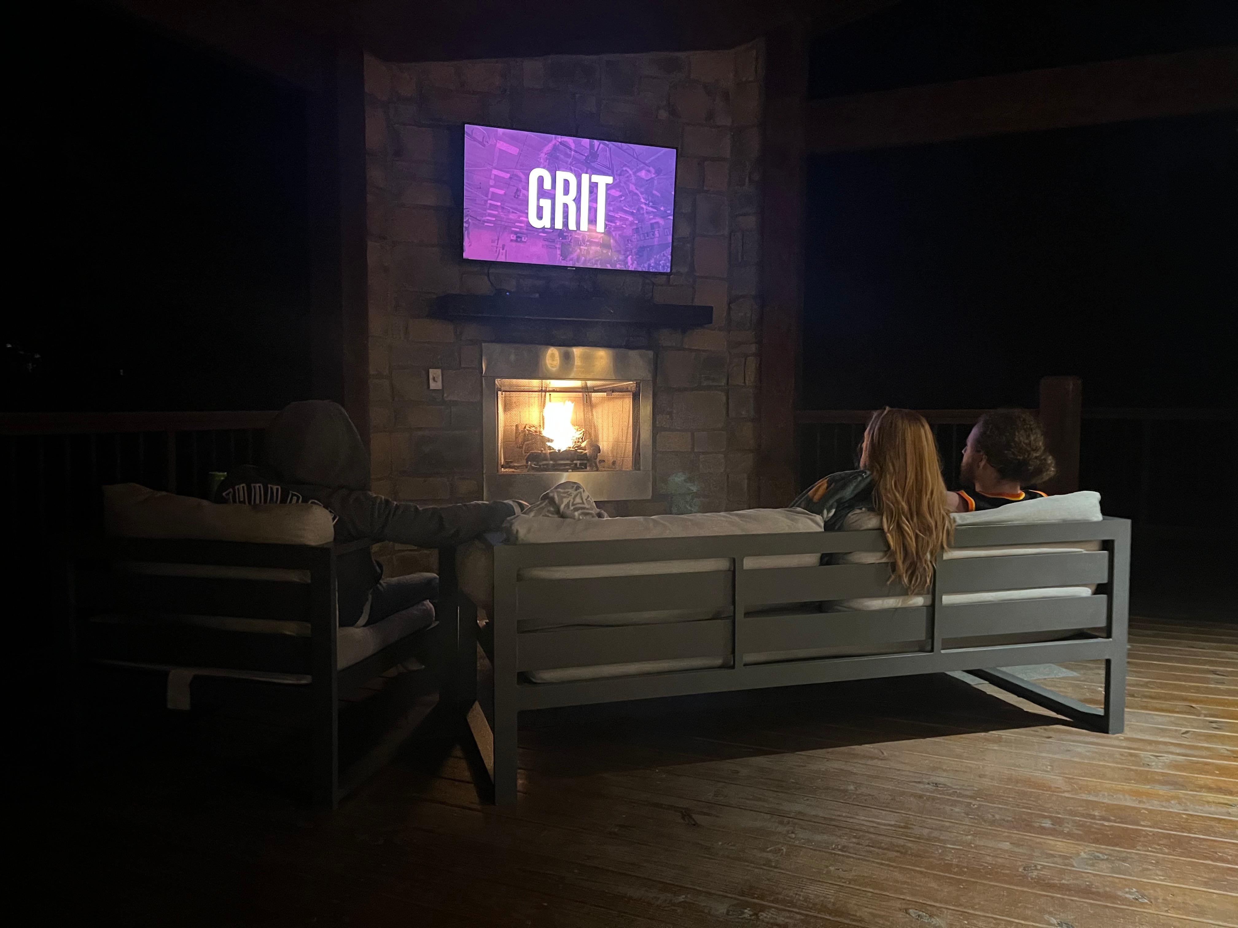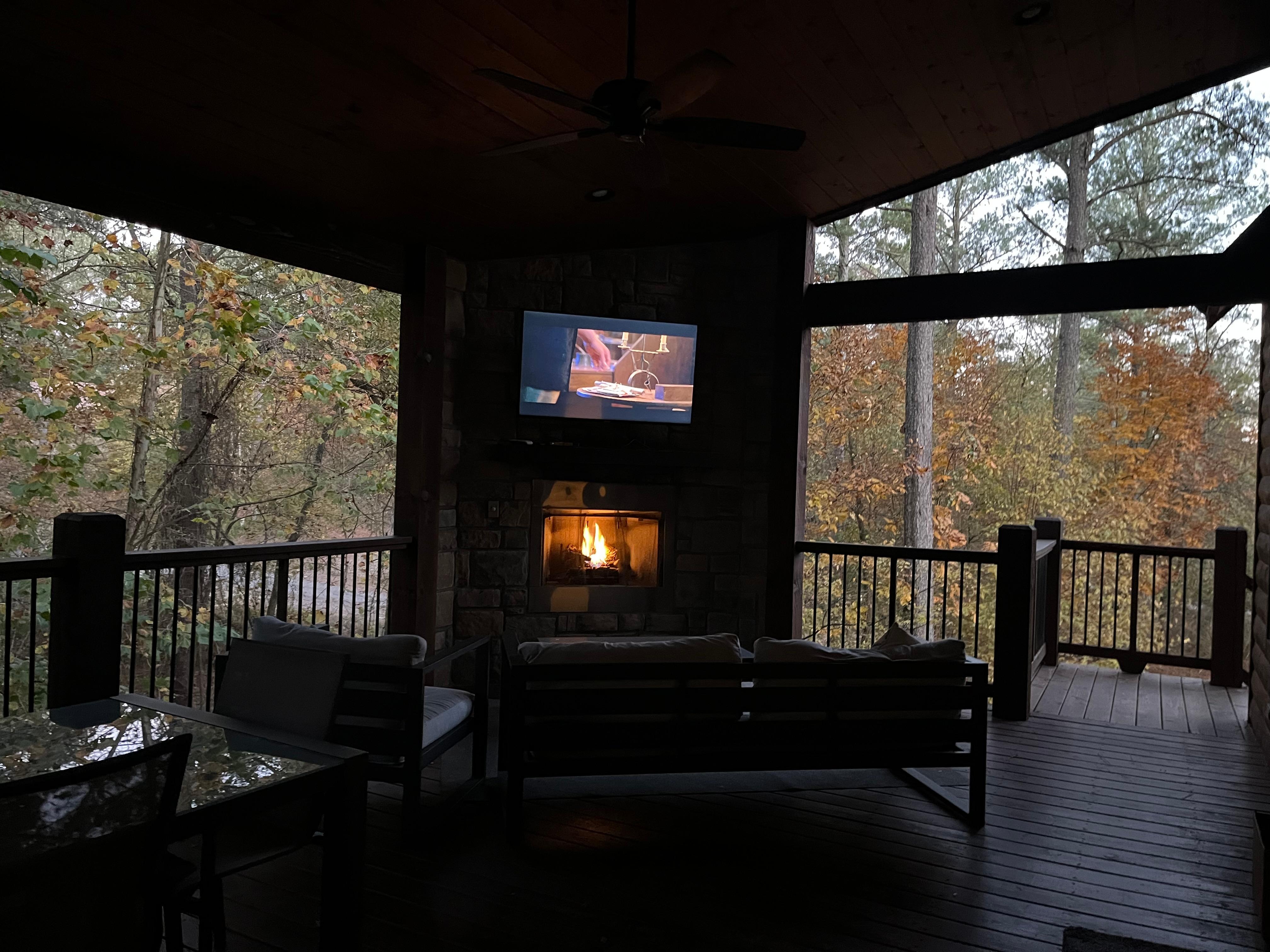 Rymligt däckområde med bekväma utemöbler, 55 "TV, öppen spis, Weber-grill, matbord