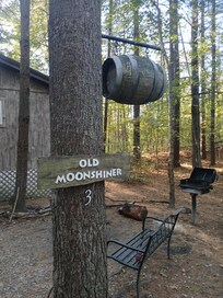 Enjoy a getaway Moonshiner style! Included are a full kitchen and eating area for 2 people, a half bath, and living room. The bedroom offers a walk-in shower overlooking the forest. Outside the screened-in porch a private spa hot tub. And only a few steps from the front porch is a brick charcoal grill and fire pit. Don't miss out on this unique cabin deep in the heart of Waynes national forest. Book your getaway today.