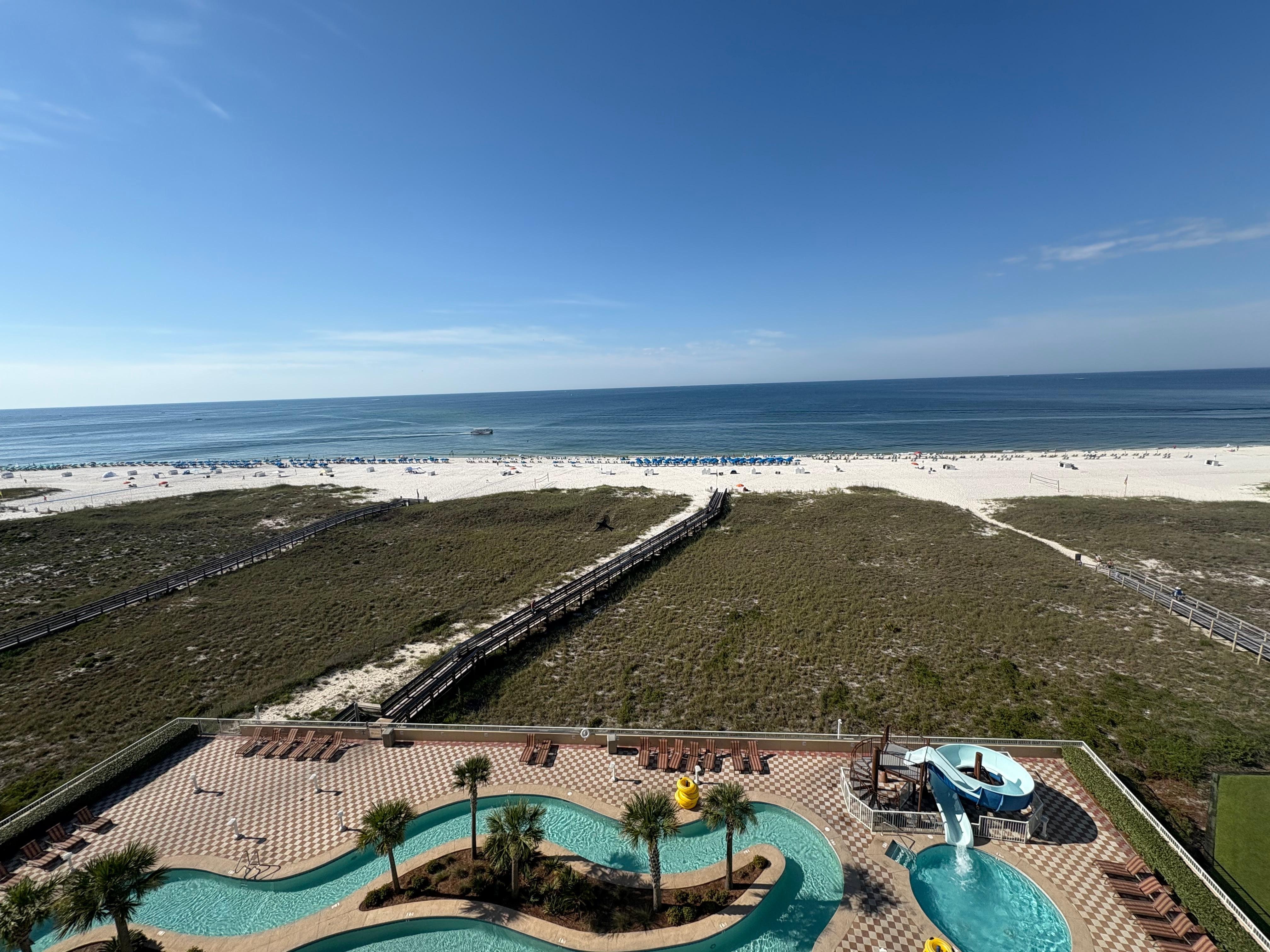 It is perfectly situated on the 7th Floor with direct elevator access. The large beachfront balcony with table/chairs and lounge seating overlooks the outdoor pool plus lazy rive and the beautiful Gulf front. You'll be able to sit back and enjoy the breathtaking Sunrise and Sunset views!!!