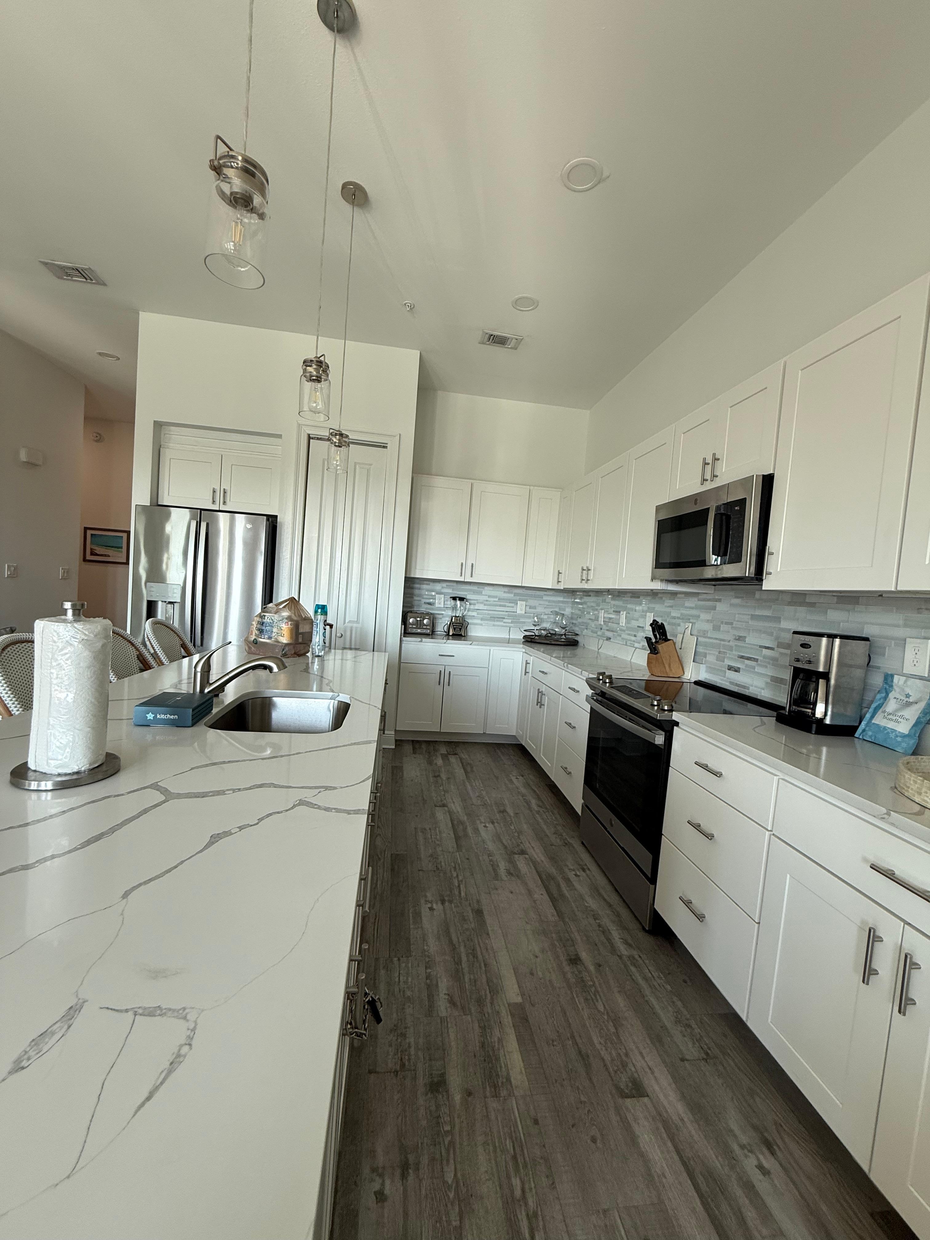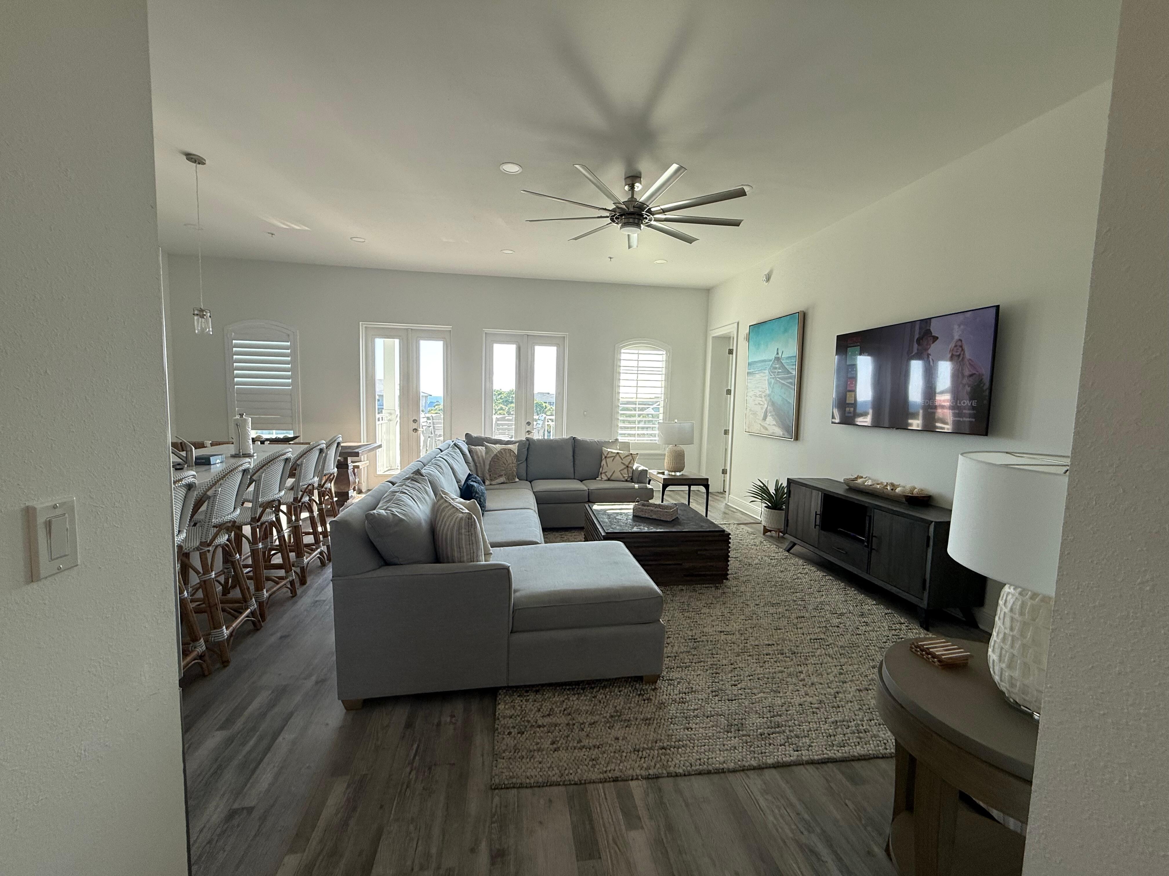 Bedrooms feature King, King and one Queen Bed, all have a Smart 50" TV. Two have private baths, while one shares a bath off the hallway with a tub shower combo.